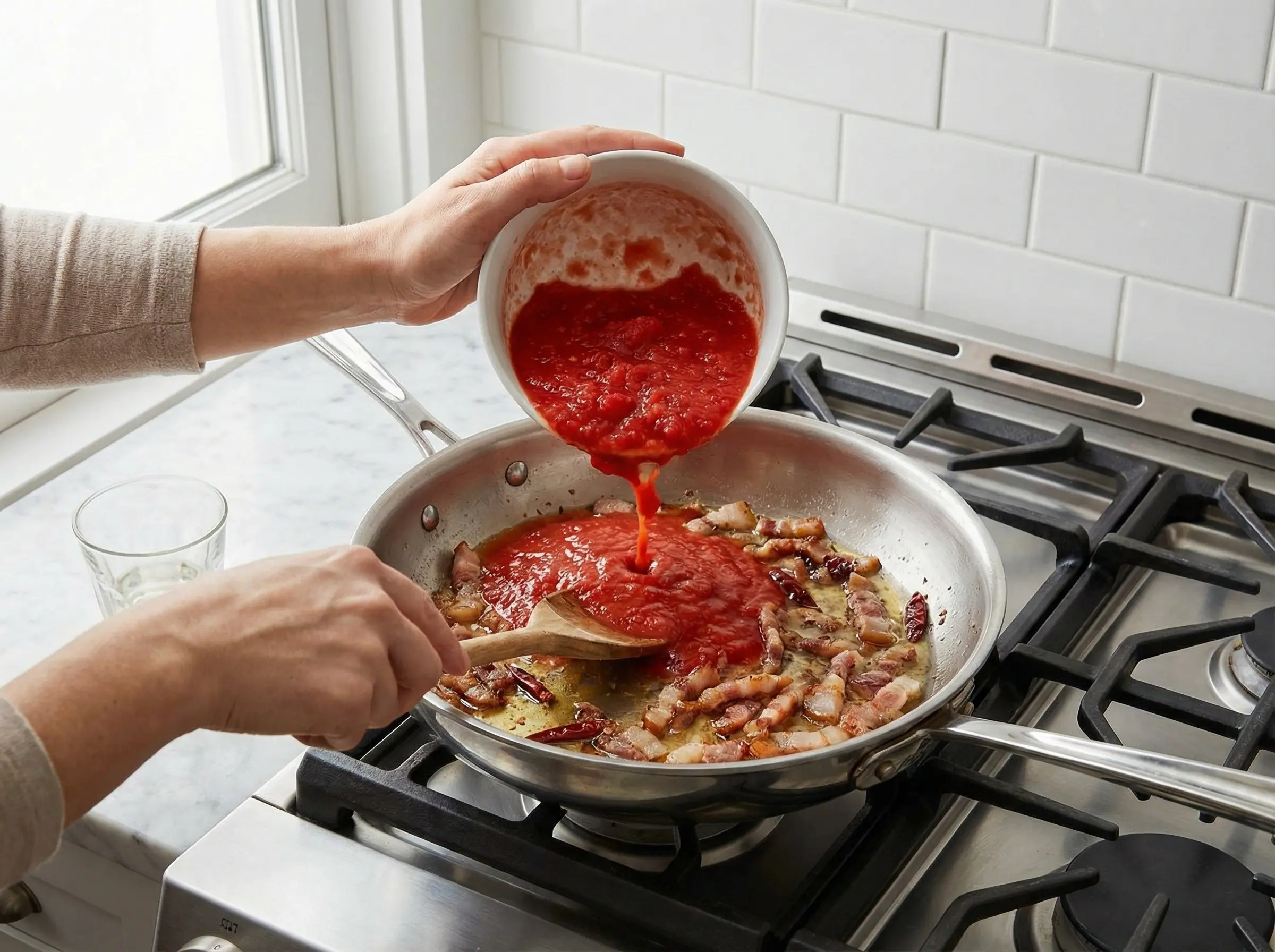 Build the sauce. Add the dried chili (whole or crumbled) or red pepper flakes to the pan with the guanciale. Stir for 30 seconds until fragrant. Carefully pour in the white wine - it will sizzle and steam. Let the wine simmer and reduce by about half, scraping up any browned bits from the bottom of the pan, about 2 minutes. Add the crushed tomatoes and stir to combine. Bring to a simmer, then reduce heat to low. Let the sauce cook gently for 15-20 minutes, stirring occasionally, until slightly thickened and the tomatoes have lost their raw edge. The sauce should not be too thick - it needs to remain fluid enough to coat the pasta.