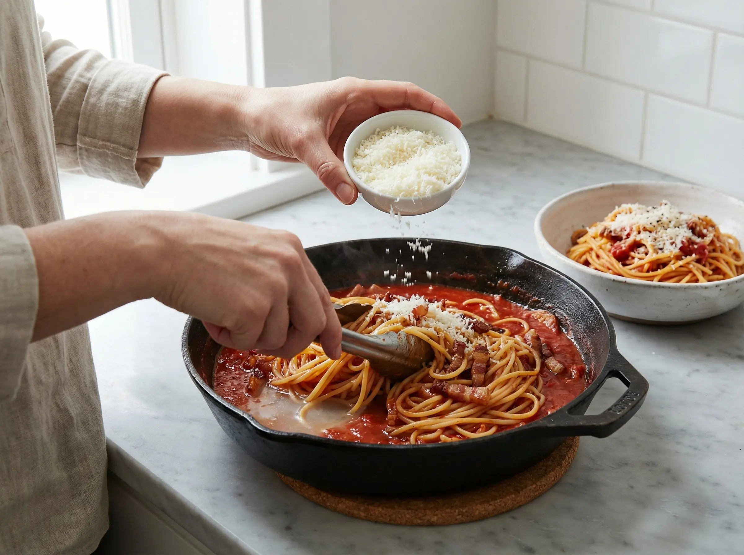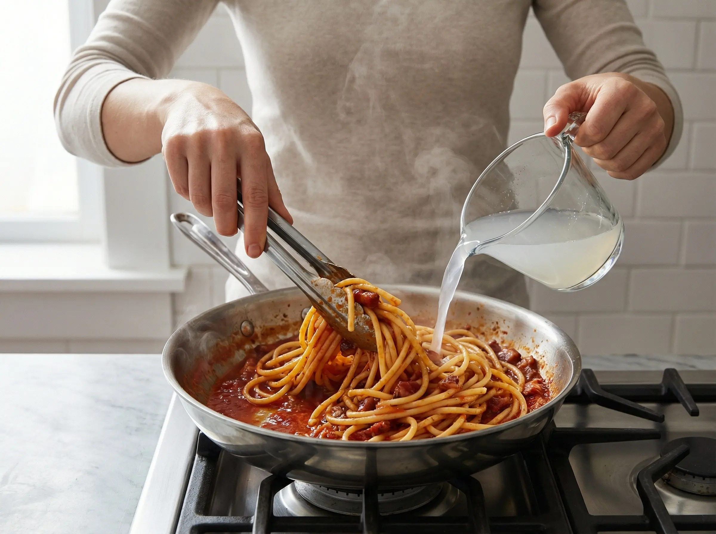Combine pasta and sauce. Using tongs, transfer the drained pasta directly into the pan with the sauce. Do not rinse the pasta - you want that starchy coating. Toss vigorously over medium heat for 1-2 minutes, adding splashes of pasta water as needed to keep the sauce fluid and glossy. The pasta should absorb some sauce while remaining well-coated. The constant motion helps emulsify the rendered guanciale fat with the tomato sauce, creating a silky, cohesive coating. Remove the pan from heat.