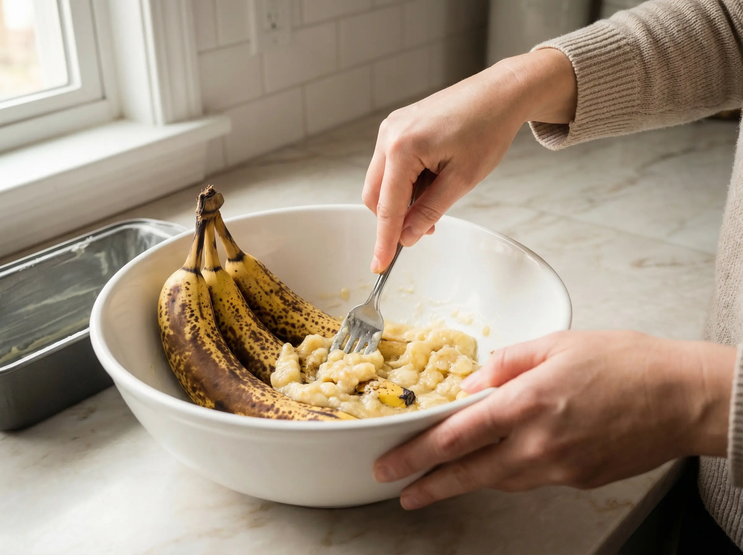 Preheat your oven to 350°F (175°C). Grease a 9x5 inch loaf pan with butter or cooking spray, or line it with parchment paper for easy removal. The key to great banana bread starts with the bananas - they should be very ripe with lots of brown spots or even completely brown peels. The riper the bananas, the sweeter and more flavorful your bread will be. In a large mixing bowl, mash the 3 ripe bananas with a fork until mostly smooth. Some small lumps are perfectly fine and will add texture to the finished bread. You should have about 1 to 1.5 cups of mashed banana. The bananas provide natural sweetness, moisture, and that distinctive banana flavor that makes this bread irresistible.