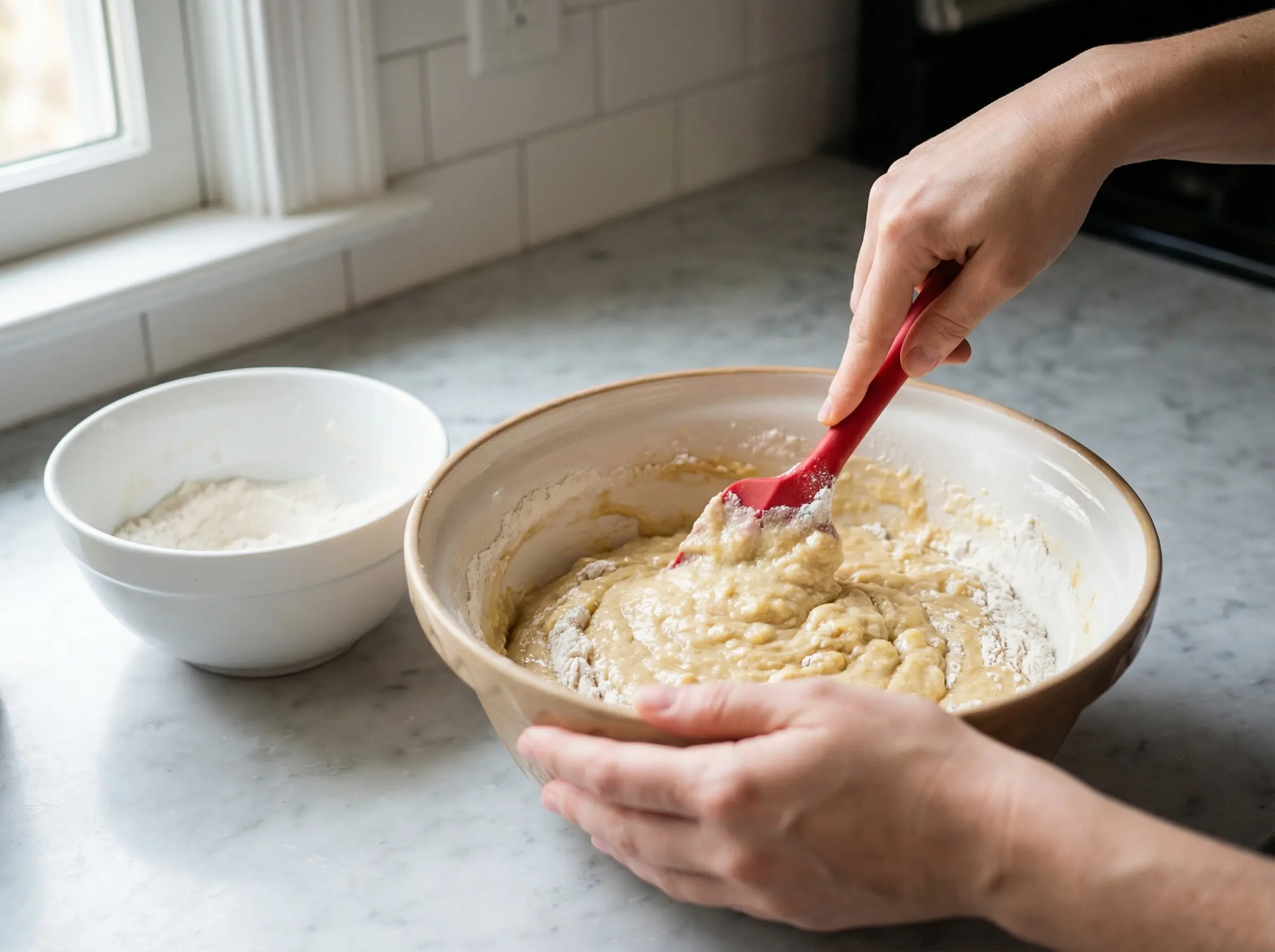 In a separate medium bowl, whisk together the flour, baking soda, and salt. This ensures the leavening agent and salt are evenly distributed throughout the flour. The baking soda will react with the acidity in the bananas to create a tender crumb and help the bread rise. Once mixed, gently fold the dry ingredients into the wet banana mixture using a rubber spatula or wooden spoon. Stir just until the flour is incorporated and you no longer see dry streaks - the batter will be thick and slightly lumpy. This is critical: do not overmix or beat the batter vigorously. Overmixing develops the gluten in the flour, which will result in a tough, dense, bread-like texture instead of the tender, cake-like crumb you want. A few lumps in the batter are perfectly fine.