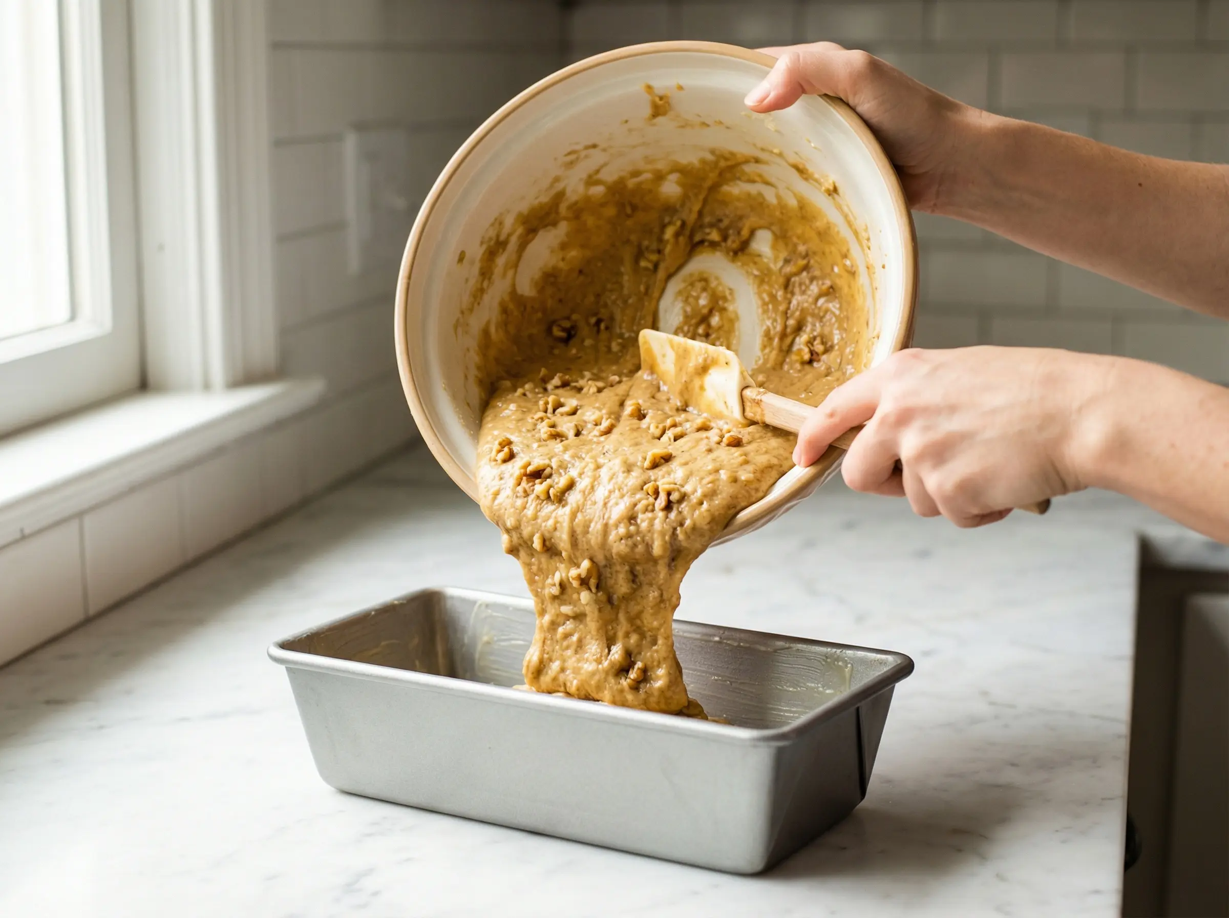 If you are adding walnuts or other mix-ins like chocolate chips, gently fold them into the batter now with just a few strokes. Pour the batter into your prepared loaf pan, using a spatula to scrape all the batter from the bowl and smooth the top. The batter should fill the pan about two-thirds full. Give the pan a gentle tap on the counter to release any air bubbles. At this point, you can optionally sprinkle a little extra sugar on top for a slightly crunchy crust, or place a few banana slices on top for decoration, though this is purely aesthetic and not necessary.