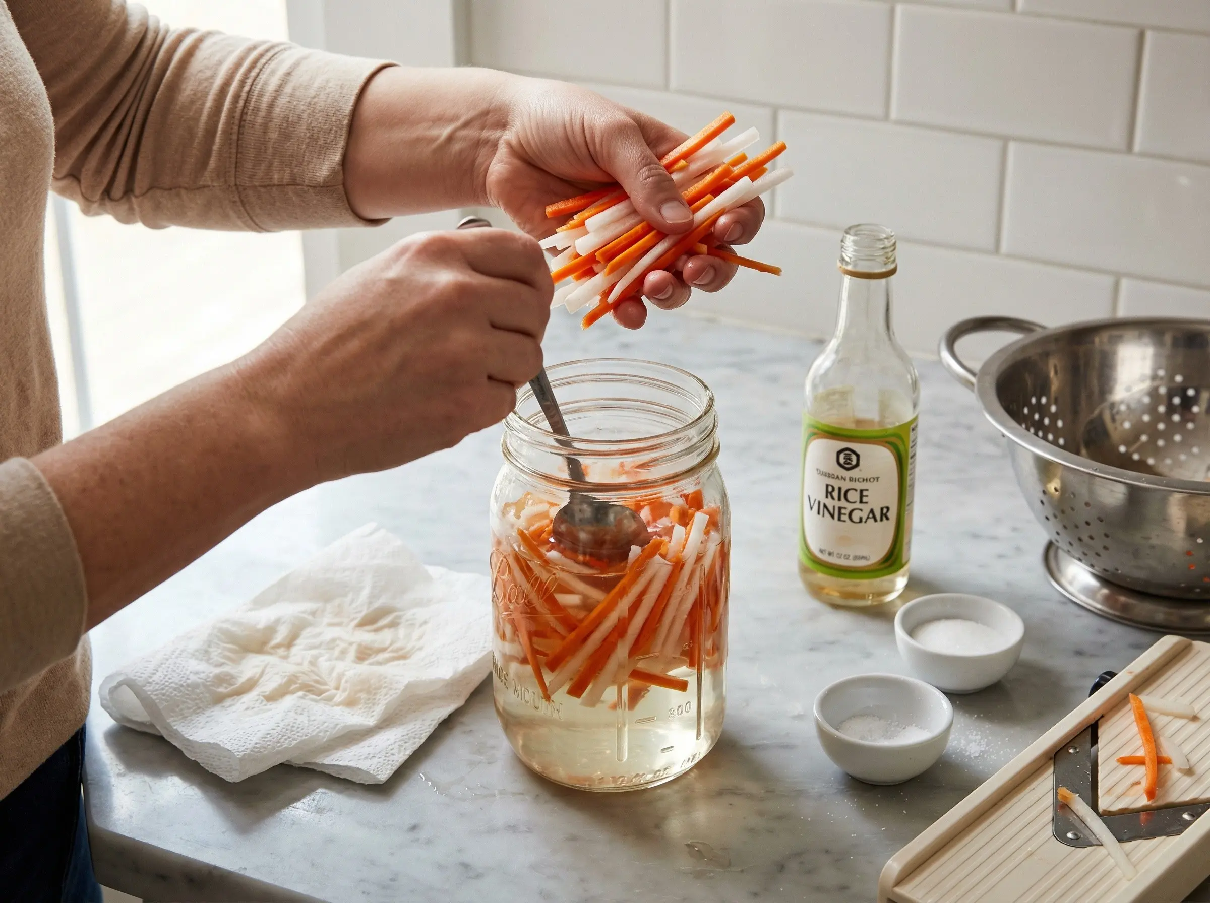 Make the do chua (pickled vegetables) first - they need time to pickle and are essential to authentic banh mi. Julienne the daikon radish and carrots into thin matchsticks about 2-3 inches long. Place them in a colander, sprinkle with the salt, and let sit for 15 minutes to draw out excess moisture. Gently squeeze out the liquid - this helps the vegetables stay crunchy and absorb the pickling brine better. In a bowl or jar, dissolve the sugar in the rice vinegar, stirring until completely dissolved. Add the squeezed vegetables and toss to coat. Let pickle for at least 30 minutes, or refrigerate for up to 2 weeks. The longer they pickle, the more flavorful they become.
