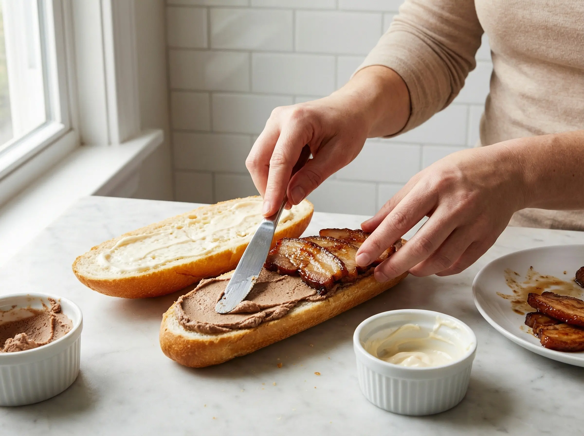 Assemble the banh mi in the proper order for the best experience. Open the baguette and spread a generous layer of pate on the bottom half - about 1 tablespoon per sandwich. Spread mayonnaise on the top half. Layer the protein (pork belly, cold cuts, or your choice) over the pate. The pate and meat form the rich, savory foundation of the sandwich.