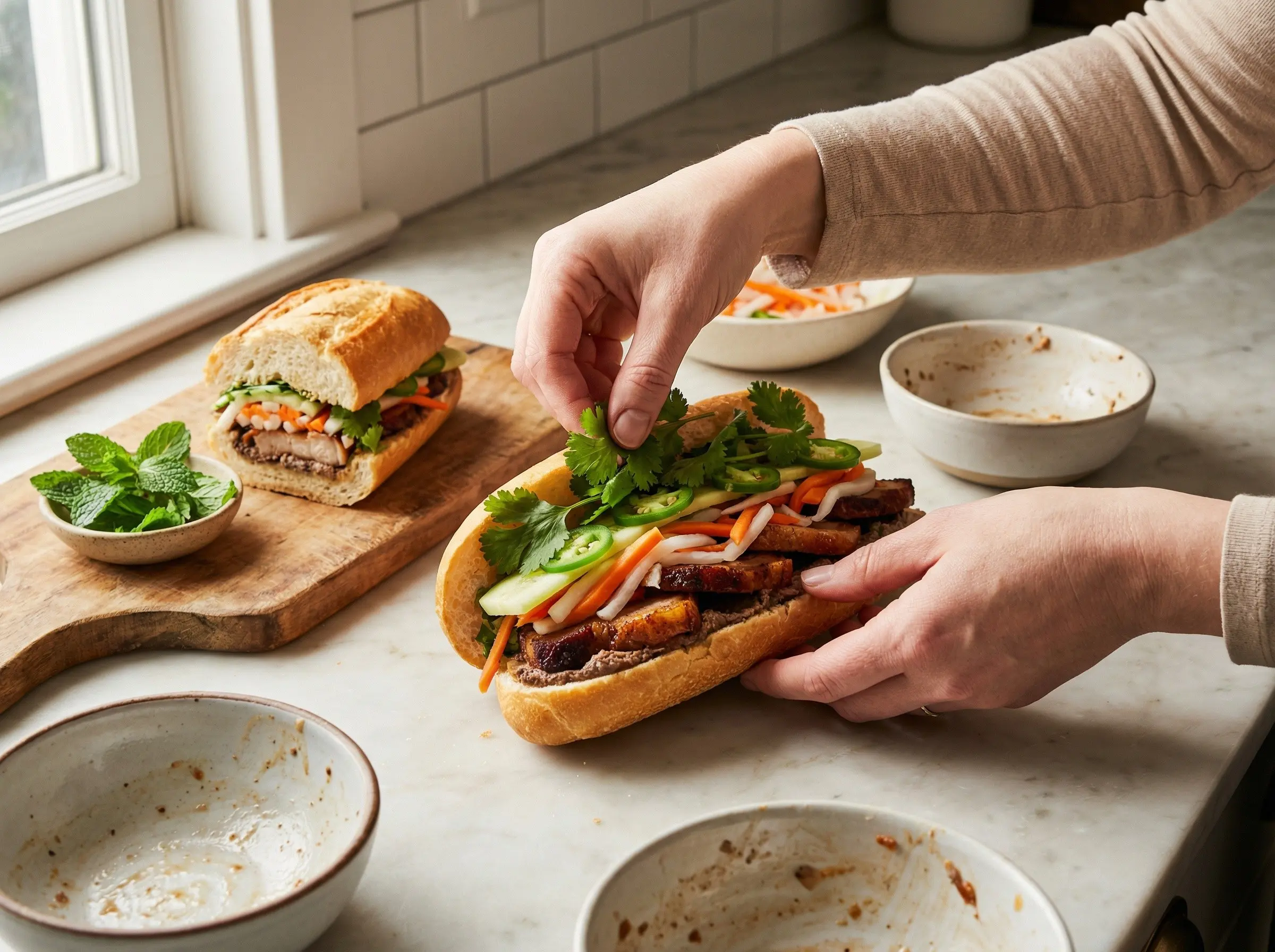 Add the fresh vegetables and herbs. Drain the do chua well and pile a generous amount of the pickled daikon and carrot over the meat - do not be shy, the pickled vegetables are essential for balance. Add cucumber slices, a generous handful of fresh cilantro sprigs, and sliced jalapenos to taste. Add fresh mint leaves if using. The sandwich should be stuffed full but still able to close. Press the top half down gently to compact the fillings slightly. Serve immediately while the bread is still crispy. Banh mi are meant to be eaten right away - the contrast between the crispy bread and the moist fillings is fleeting. Cut in half on the diagonal for easier eating if desired. A properly made banh mi should shatter when you bite through the crust, giving way to the complex layers of rich, tangy, fresh, and spicy flavors within.