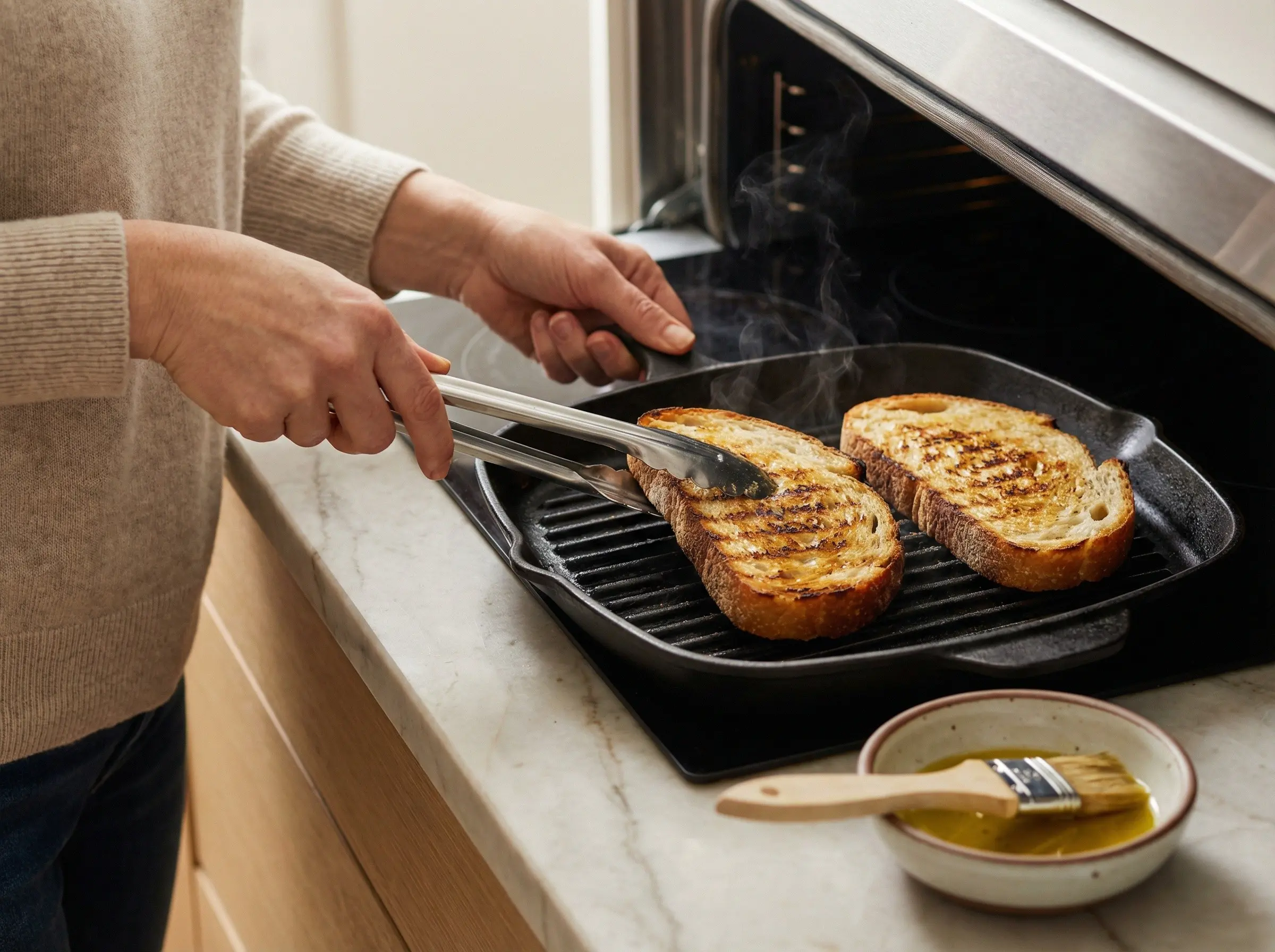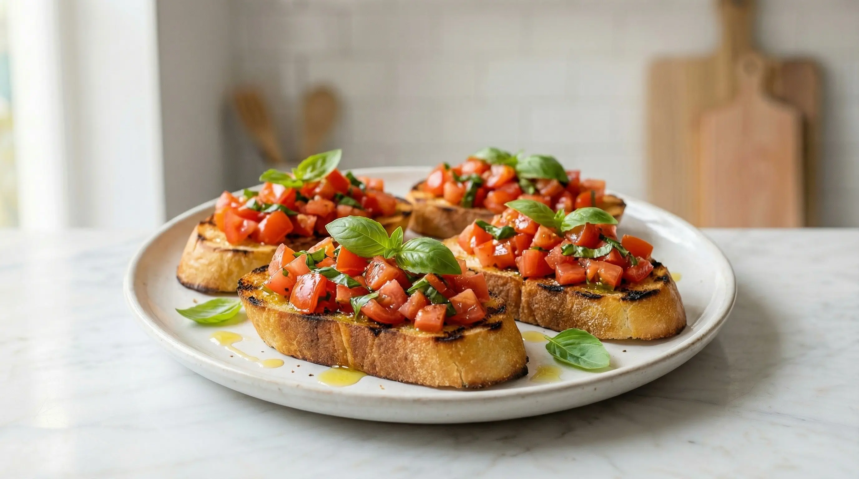Toast the bread slices until golden and crispy. You have several options: grill them on a grill or grill pan for authentic charred flavor, broil them in the oven for 2-3 minutes per side, or toast them in a toaster. For the most authentic flavor, brush each side lightly with olive oil before grilling or broiling - this helps them crisp up beautifully and adds flavor. The bread should be golden brown and crunchy on the surface but still have some give in the center. If you grill or broil, watch carefully as bread can go from perfect to burnt very quickly. You want a nice crunch that will stand up to the juicy tomato topping.