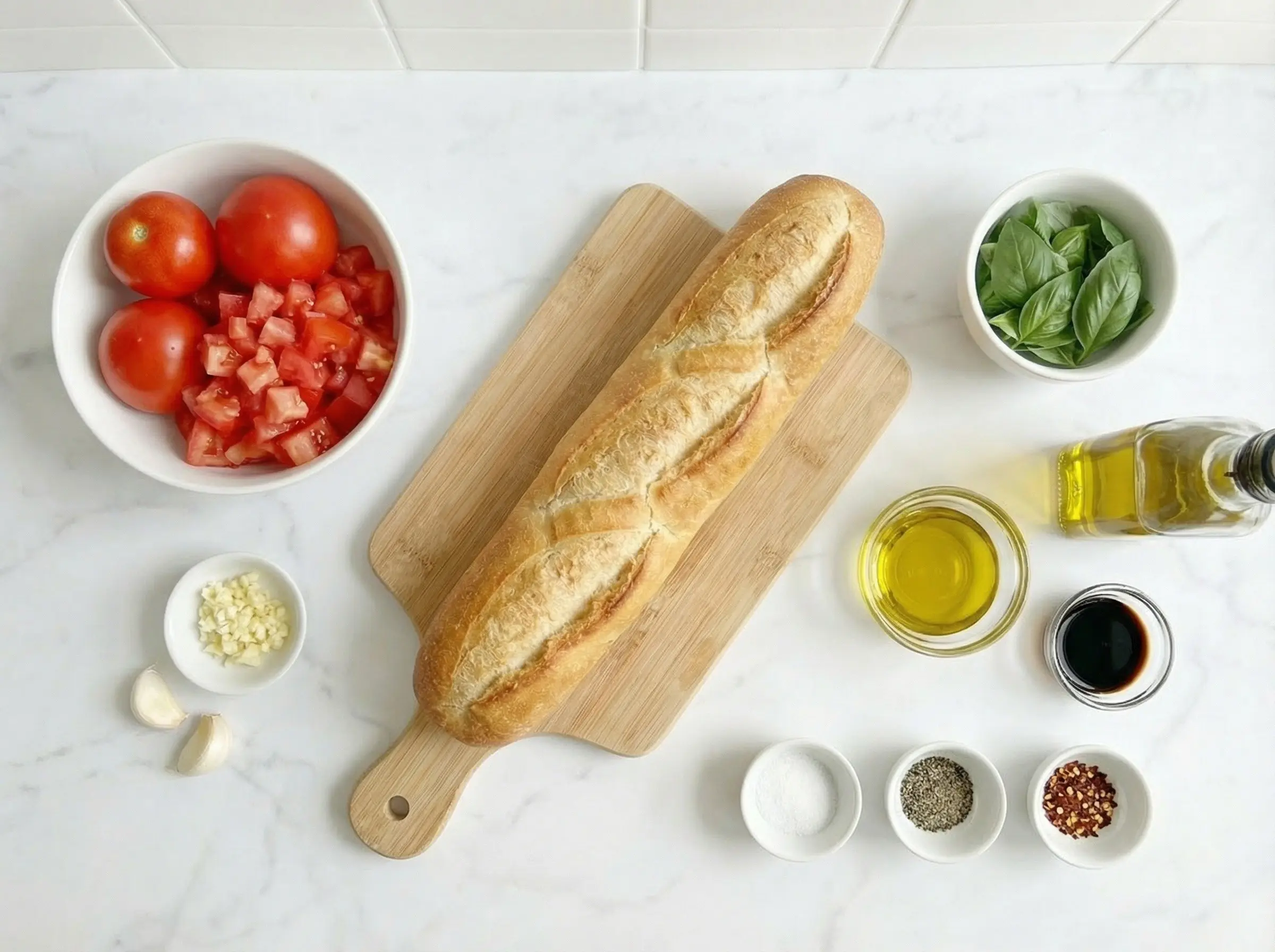 Start by preparing the tomato topping, which should be done no more than 30-60 minutes before serving to prevent the bread from becoming soggy. Choose ripe, flavorful tomatoes - this is crucial as tomatoes are the star of this dish. Roma or plum tomatoes work well as they are less watery, but any ripe summer tomato will be delicious. Dice the tomatoes into small pieces, about 1/4 to 1/2 inch cubes. If you prefer less moisture, you can remove the seeds and pulp, though many Italian cooks leave them in for more flavor. Place the diced tomatoes in a medium bowl and add the minced garlic, chopped fresh basil, extra virgin olive oil, balsamic vinegar, salt, black pepper, and red pepper flakes if using. Toss everything together gently until well combined. Taste and adjust seasoning - you might want more salt, a splash more vinegar for acidity, or more basil. Let the mixture sit at room temperature while you prepare the bread, allowing the flavors to meld.