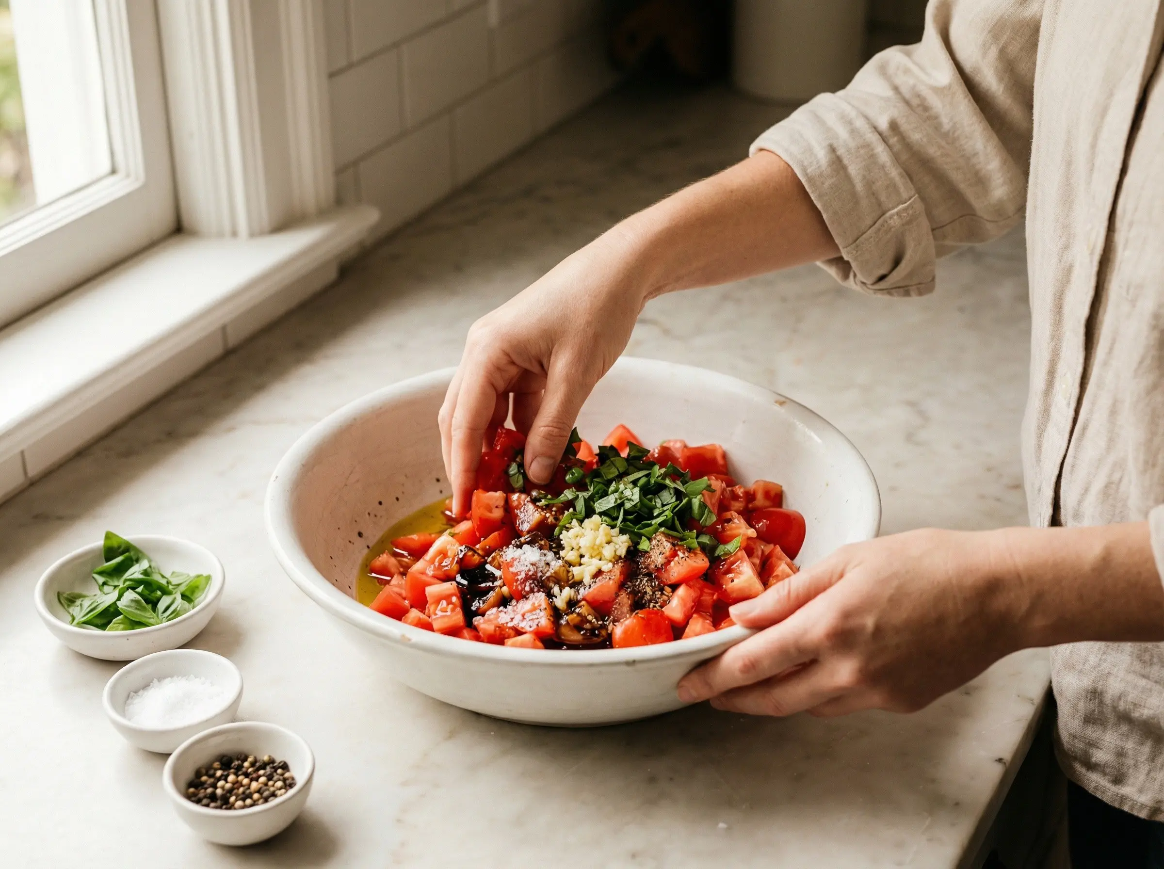 Bruschetta is one of the oldest and simplest preparations in Italian cuisine, with roots stretching back to ancient Rome. The name comes from the Italian verb "bruscare," meaning to roast over coals. In its most basic form, bruschetta was simply toasted bread rubbed with garlic and drizzled with olive oil - a way for farmers and peasants to use up stale bread and sample the season's new olive oil. This humble dish served as a quick meal or snack in the fields, showcasing the Italian genius for transforming the simplest ingredients into something delicious through quality and technique rather than complexity. The tomato-topped version of bruschetta that is now ubiquitous emerged much later, as tomatoes were not introduced to Italy from the Americas until the 16th century and were not widely accepted as food until the 18th century. Once Italians embraced tomatoes, particularly in the south, the combination of ripe summer tomatoes with the traditional garlic-rubbed toast became a natural evolution. This preparation is specifically called "bruschetta al pomodoro" in Italy. In central Italy, particularly in Tuscany and Lazio, bruschetta became a staple antipasto - a way to celebrate the height of summer when tomatoes are at their peak and fresh basil grows abundantly in gardens. What makes bruschetta so enduringly popular is its embodiment of Italian cooking philosophy - using the finest ingredients at their peak and letting them shine with minimal intervention. The quality of each component matters: ripe, flavorful tomatoes; fruity extra virgin olive oil; fresh basil; good crusty bread; and sweet garlic. The bread should be toasted until golden and crispy on the outside while remaining soft inside. The tomato mixture should be made shortly before serving so the tomatoes release just enough juice to moisten the bread without making it soggy. Bruschetta is best enjoyed immediately, gathered around a table with friends, embodying the Italian spirit of simple pleasures and convivial dining.