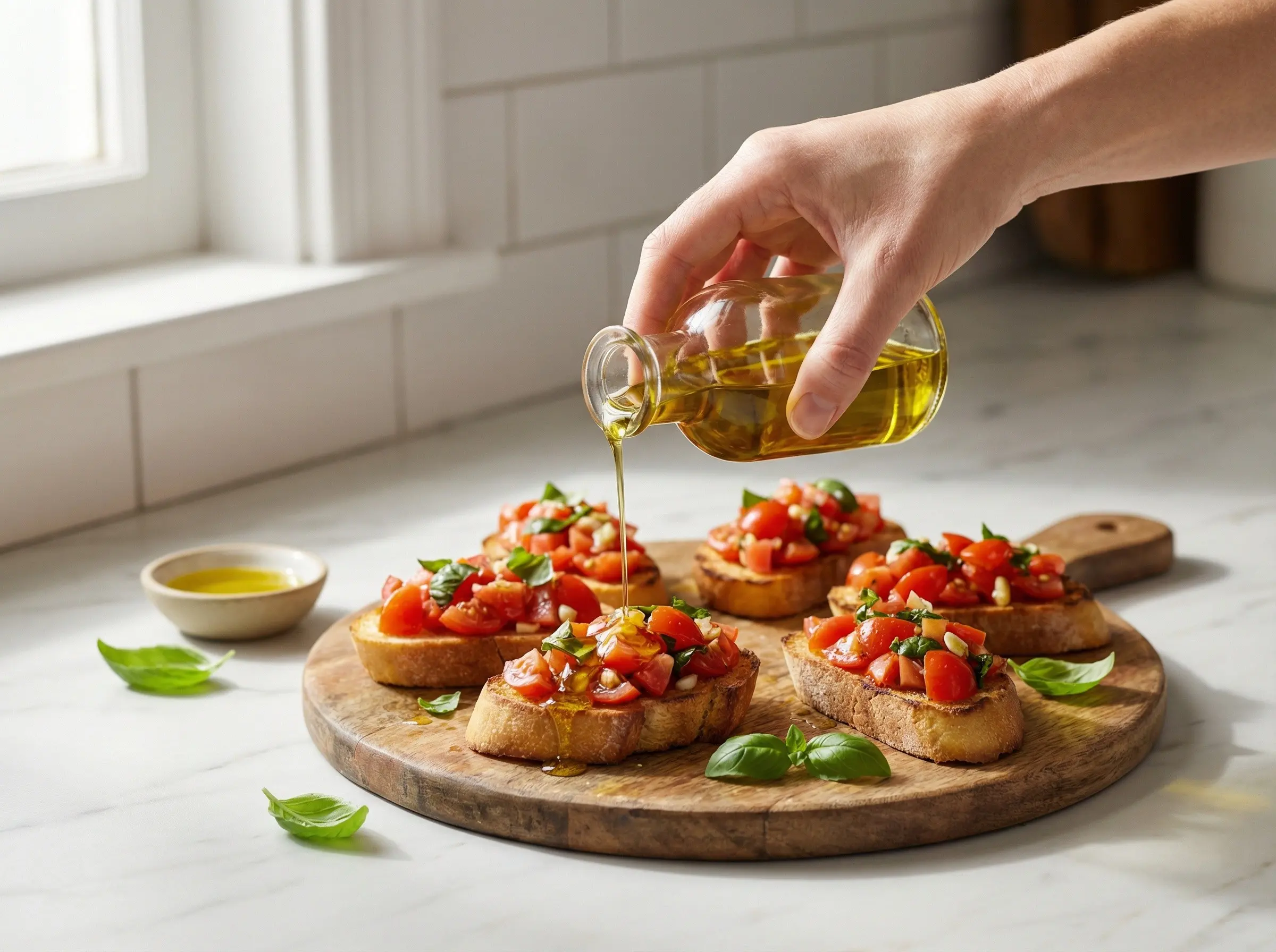 While the bread is still warm from toasting, take the whole garlic cloves and cut them in half. Rub the cut side of the garlic over one side of each toasted bread slice. The rough, toasted surface of the bread acts like a grater, pulling the garlic flavor into the bread. Use a light hand - you want a subtle garlic flavor, not overpowering. This traditional technique imparts fresh garlic flavor without the harshness of raw minced garlic sitting on top. After rubbing with garlic, drizzle each slice lightly with good quality extra virgin olive oil. The oil soaks into the warm bread and adds richness and flavor. Do not skip this step - the combination of garlic and olive oil on toasted bread is the foundation of great bruschetta.