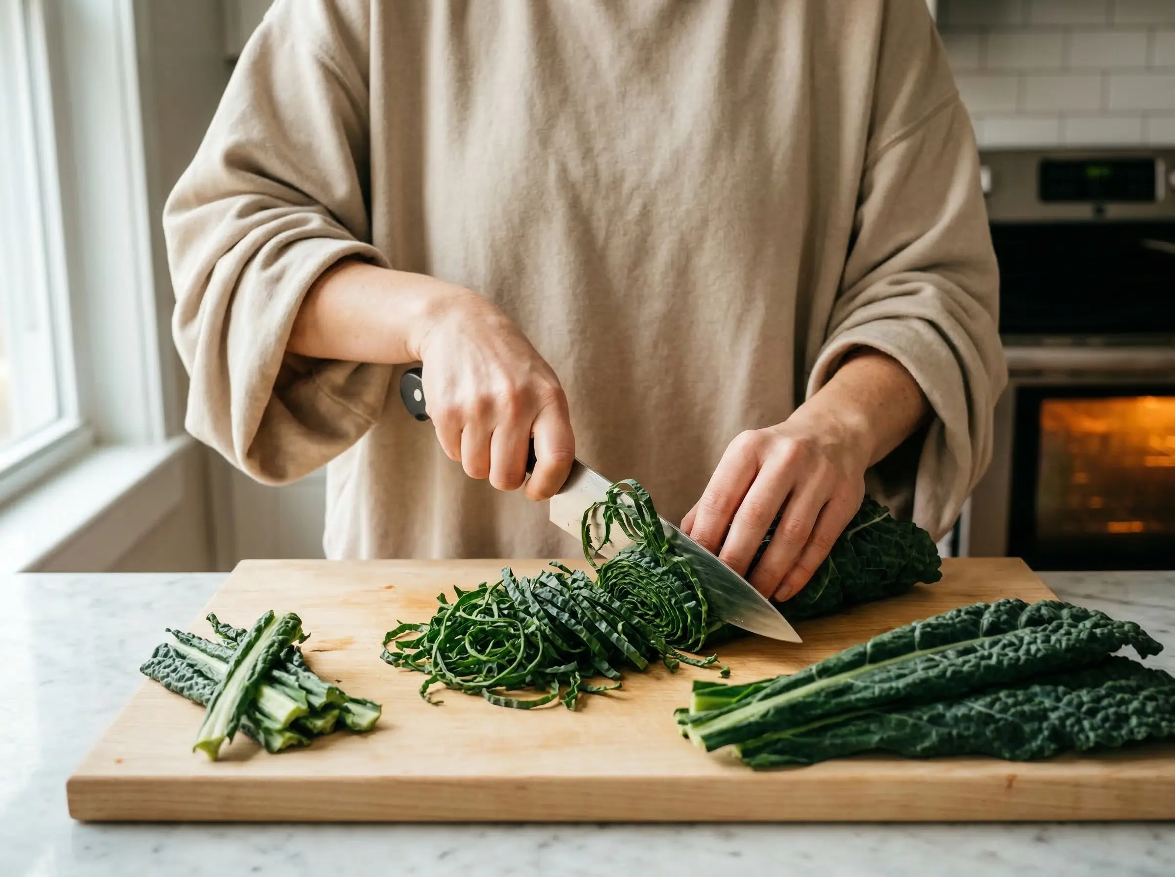 Prepare the kale. This step is essential for authentic caldo verde. Remove the tough center ribs from each kale leaf by folding the leaf in half and slicing along the stem. Stack several de-ribbed leaves, roll them tightly into a cigar shape, and slice crosswise into the thinnest possible ribbons - aim for 1/8 inch or thinner. In Portugal, there are special hand-cranked machines for this, but a sharp knife works well. The thin ribbons cook quickly and create the characteristic texture of the soup. Wash the sliced kale in cold water and set aside.
