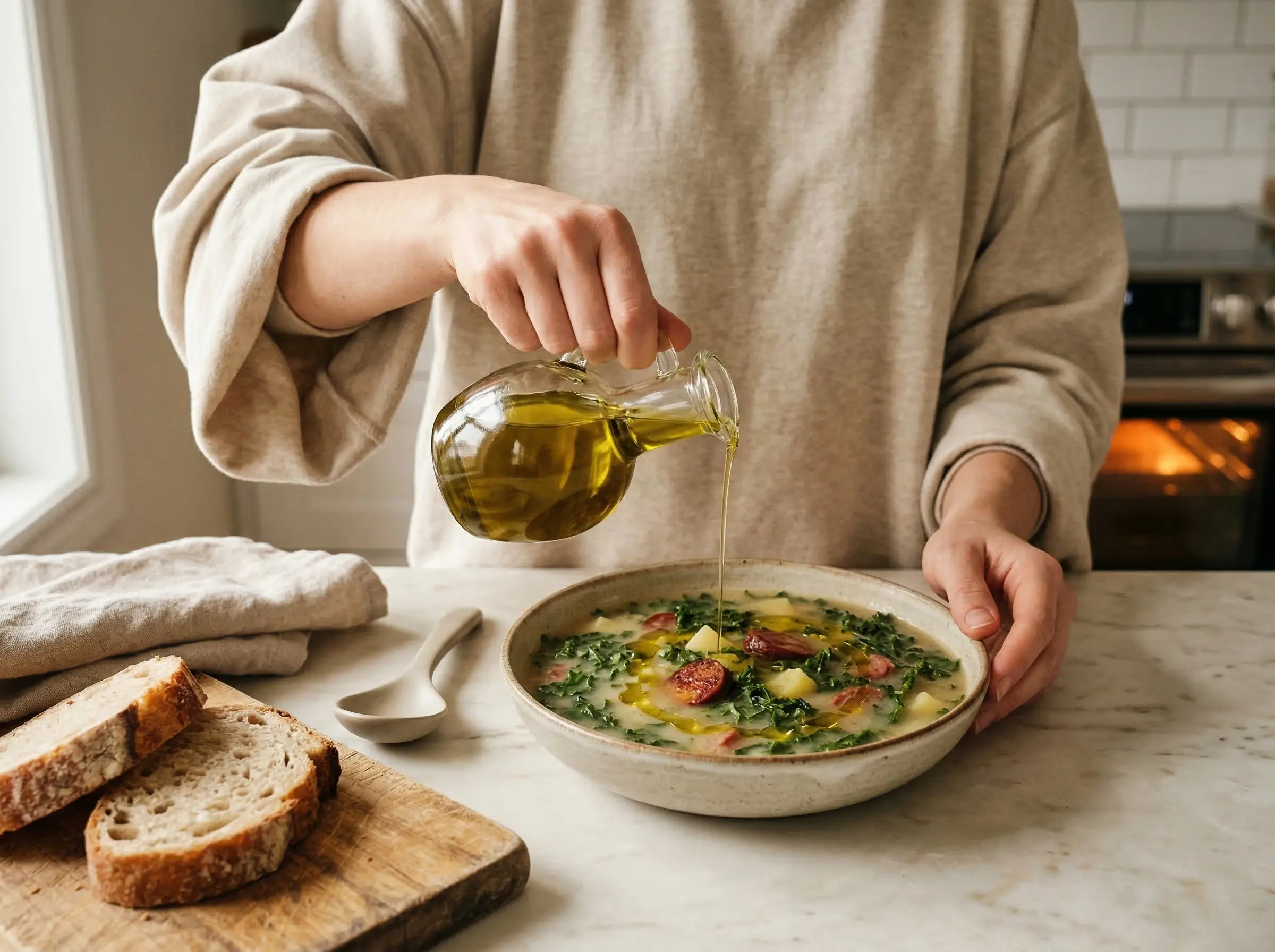 Finish and serve. Remove from heat and stir in the remaining 2 tablespoons of olive oil. Taste and adjust seasoning - caldo verde often needs a good amount of salt to bring out all the flavors. Ladle into deep bowls, ensuring each portion has kale ribbons, potato chunks, and sausage slices. Drizzle each bowl generously with additional fruity Portuguese olive oil - this final drizzle is essential, not optional. Serve immediately with thick slices of crusty bread for dunking. Caldo verde is traditionally served with broa, a dense Portuguese cornbread, but any good crusty bread works well. The soup keeps beautifully for several days and, like many soups, tastes even better the next day as the flavors meld. Thin with a little water when reheating if the potatoes have absorbed too much liquid.