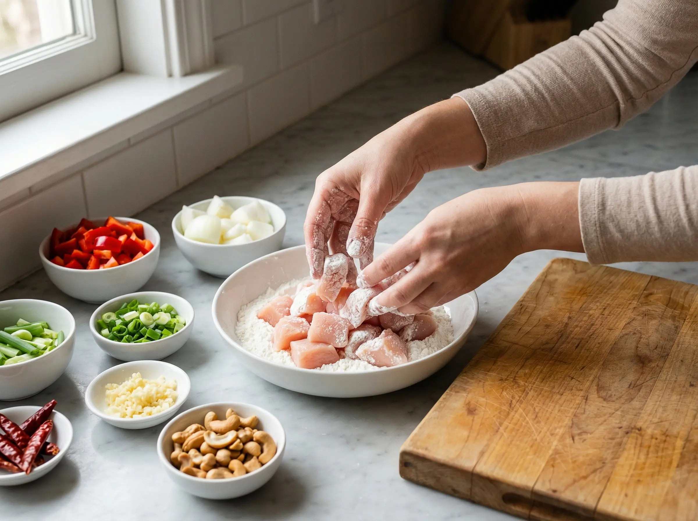 Prepare all ingredients before you start cooking as stir-frying happens very quickly. Cut the chicken into bite-sized pieces, about 1-inch cubes. Place the chicken pieces in a bowl and toss with the cornstarch until lightly coated - this helps create a silky texture and helps the sauce cling to the meat. Cut the bell pepper and onion into chunks similar in size to the chicken pieces for even cooking. Cut the green onions into 2-inch pieces, separating the white parts from the green tops. Mince the garlic. If your cashews are raw, toast them in a dry pan over medium heat for 3-4 minutes, stirring constantly, until golden and fragrant. Set aside.