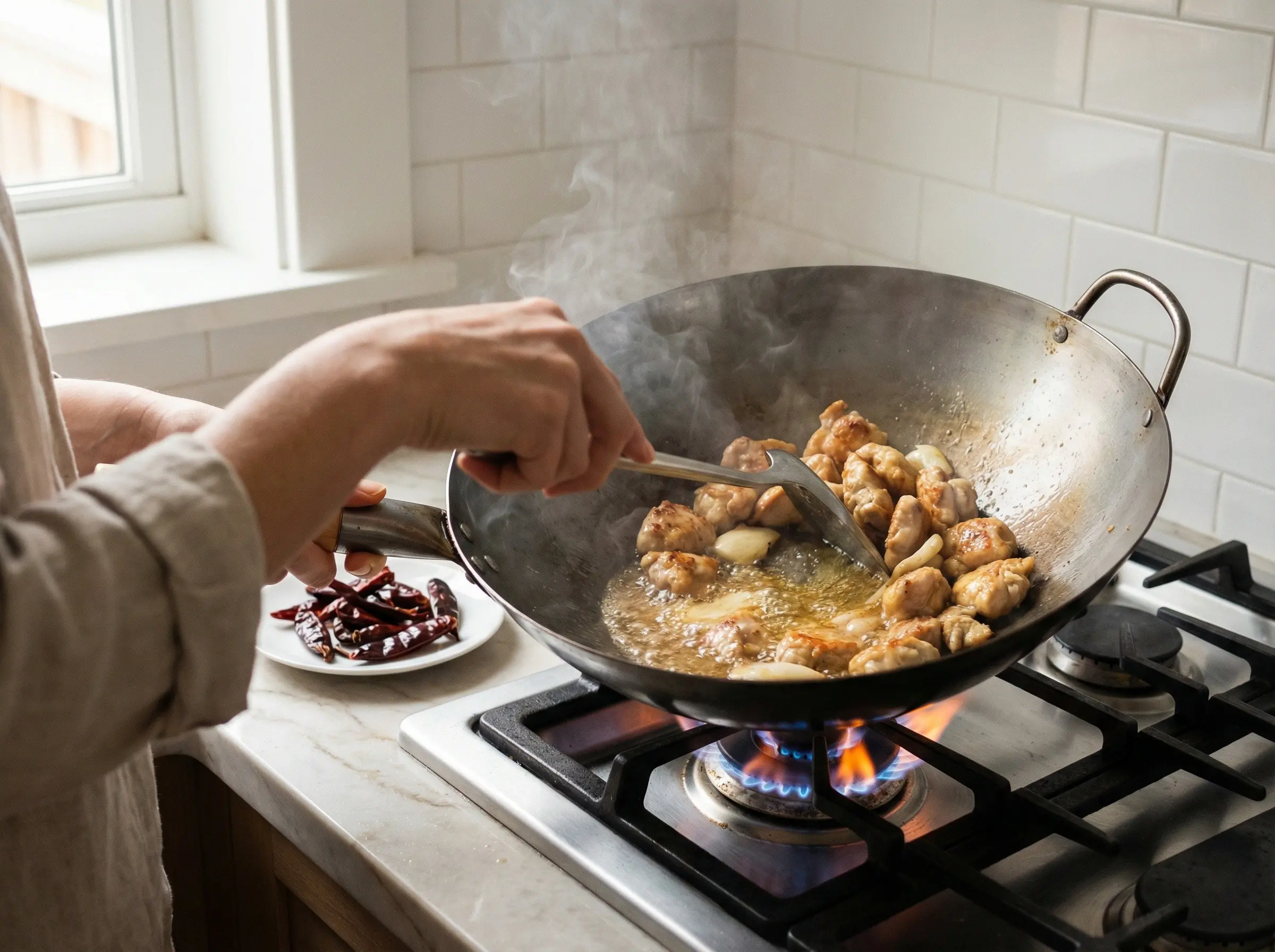 Heat a wok or large skillet over high heat until smoking. Add 2 tablespoons of the vegetable oil and swirl to coat. Add the dried red chilies and stir-fry for about 20-30 seconds until they darken slightly and become fragrant - be careful not to burn them or they will turn bitter. The chilies will release their aroma and add a subtle smoky heat to the oil. Remove the chilies and set aside. Add the cornstarch-coated chicken pieces to the hot wok in a single layer. Let them sear without stirring for about 45 seconds to develop a light golden crust, then stir-fry for another 2-3 minutes until the chicken is almost cooked through but still slightly pink inside. Transfer the chicken to a plate.