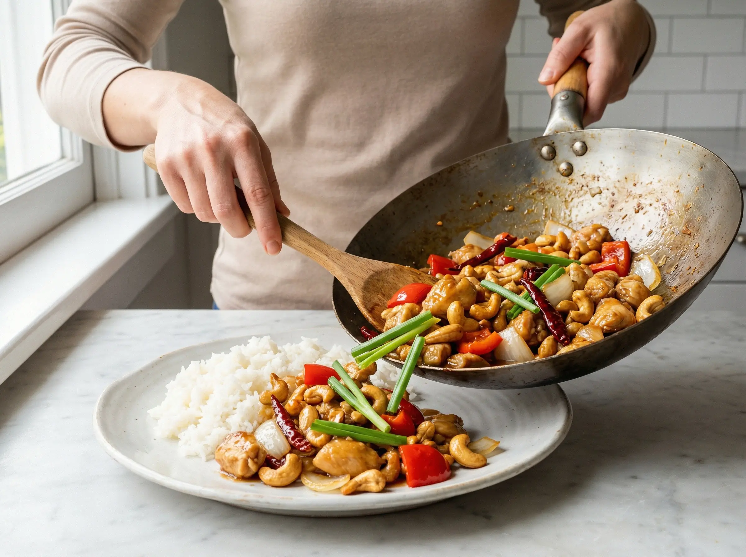 Remove the wok from heat and add the green onion tops. Toss briefly - the residual heat will wilt them slightly while preserving their fresh color and flavor. Taste and adjust seasoning if needed - add a splash more fish sauce for saltiness, a pinch of sugar for sweetness, or a squeeze of lime juice for brightness. Transfer to a serving plate immediately. The dish should be glossy and aromatic, with the cashews prominently visible throughout. Serve hot with steamed jasmine rice. The dried chilies are typically left in for presentation and a bit of extra heat for adventurous diners, though they are quite intense to eat whole. Cashew chicken is best enjoyed immediately while the cashews are still crunchy and the vegetables are crisp-tender.