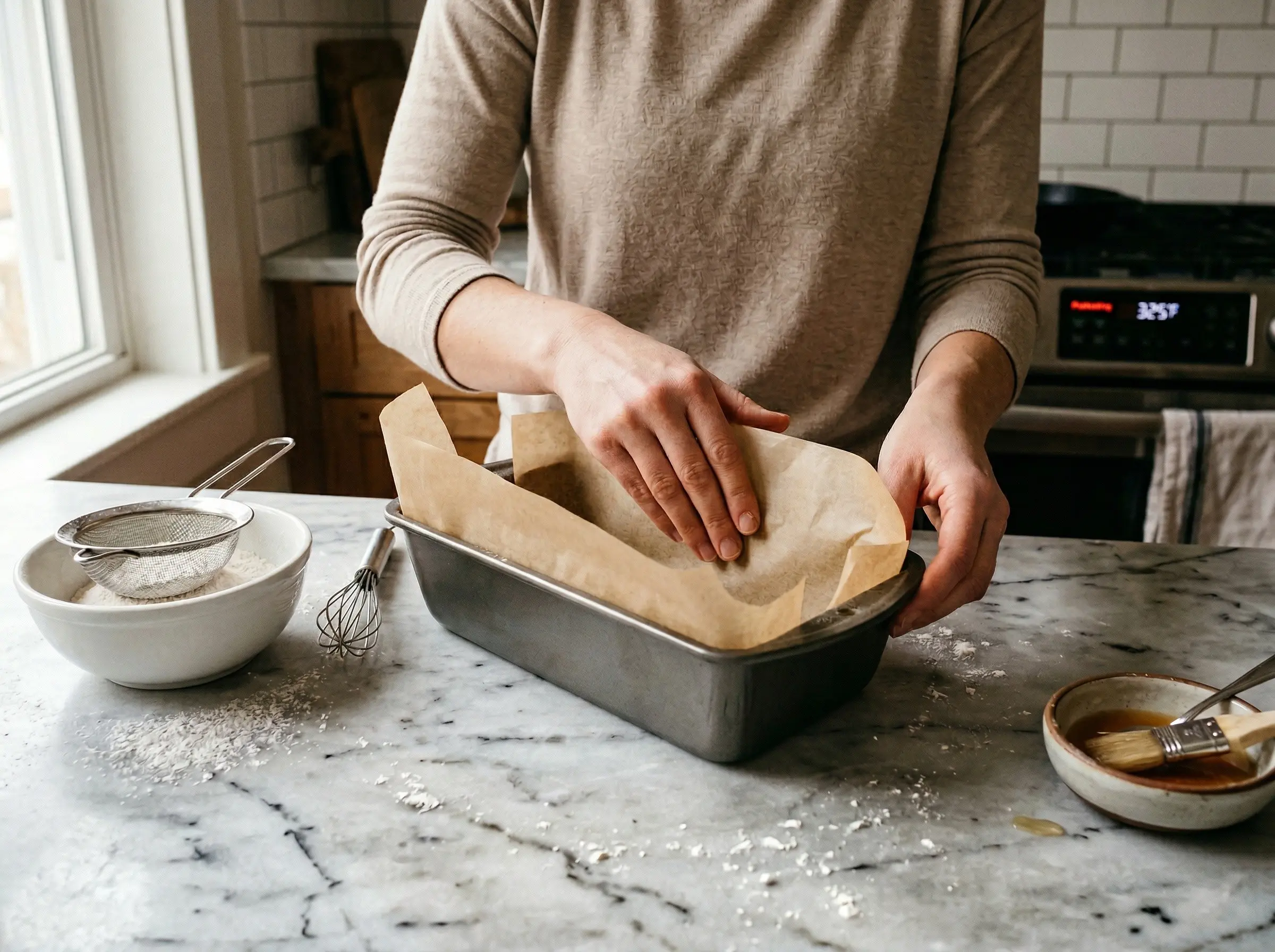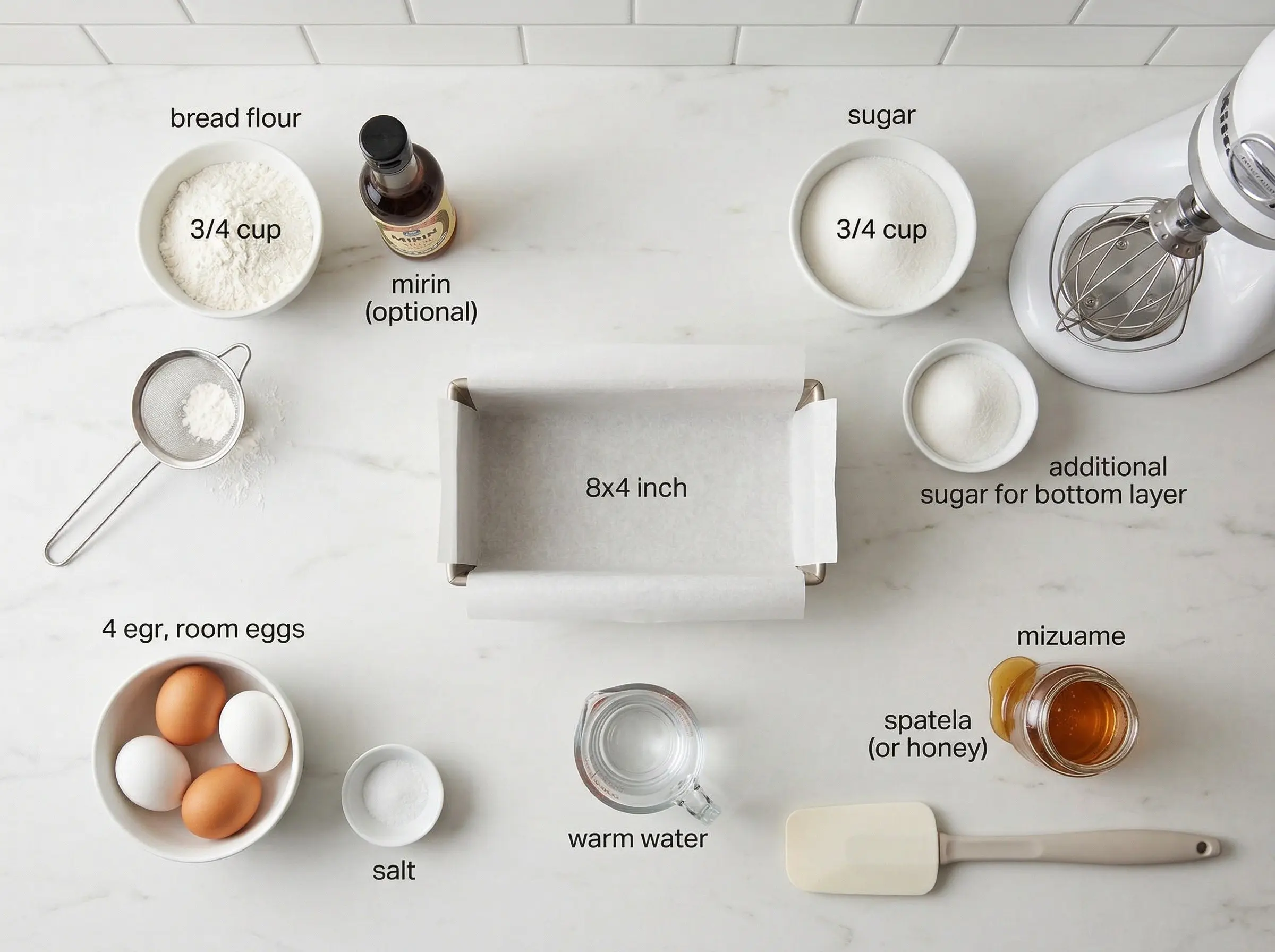 Prepare the pan and preheat the oven. Line an 8x4 inch loaf pan (or traditional wooden castella frame if you have one) with parchment paper, extending the paper above the rim by at least 2 inches on all sides - the cake will rise significantly. Preheat your oven to 325 degrees F. In a small bowl, combine the mizuame (or honey), warm water, and mirin if using. Stir until the mizuame dissolves completely. Set aside. Sift the bread flour twice - this removes lumps and aerates the flour for a finer crumb.
