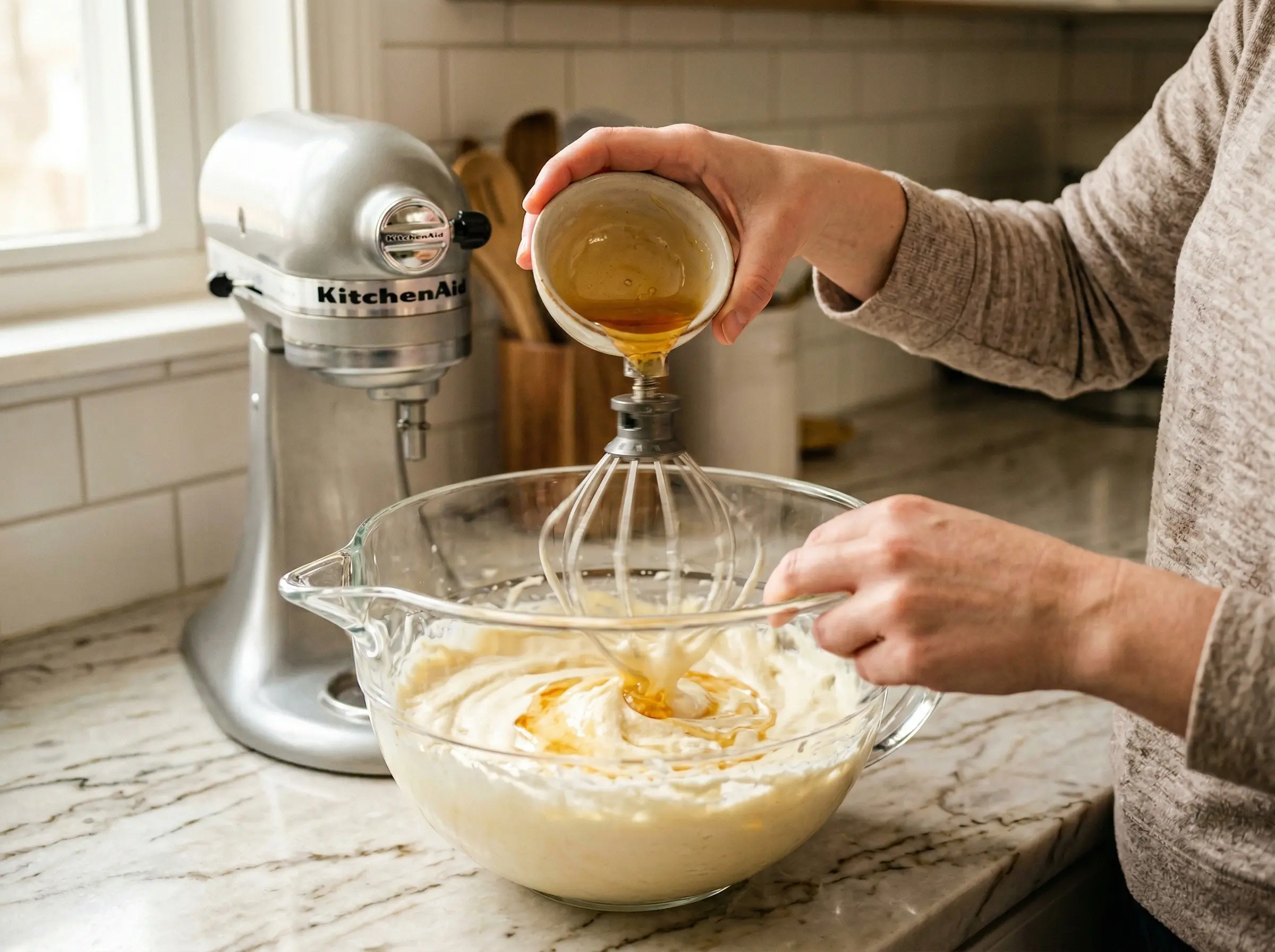 Add the mizuame mixture. With the mixer on low speed, slowly drizzle in the mizuame and water mixture. Mix just until incorporated. The mizuame provides moisture and the characteristic honey-like fragrance and keeps the cake tender for days. Do not overmix at this stage or you will deflate the air you worked so hard to incorporate.
