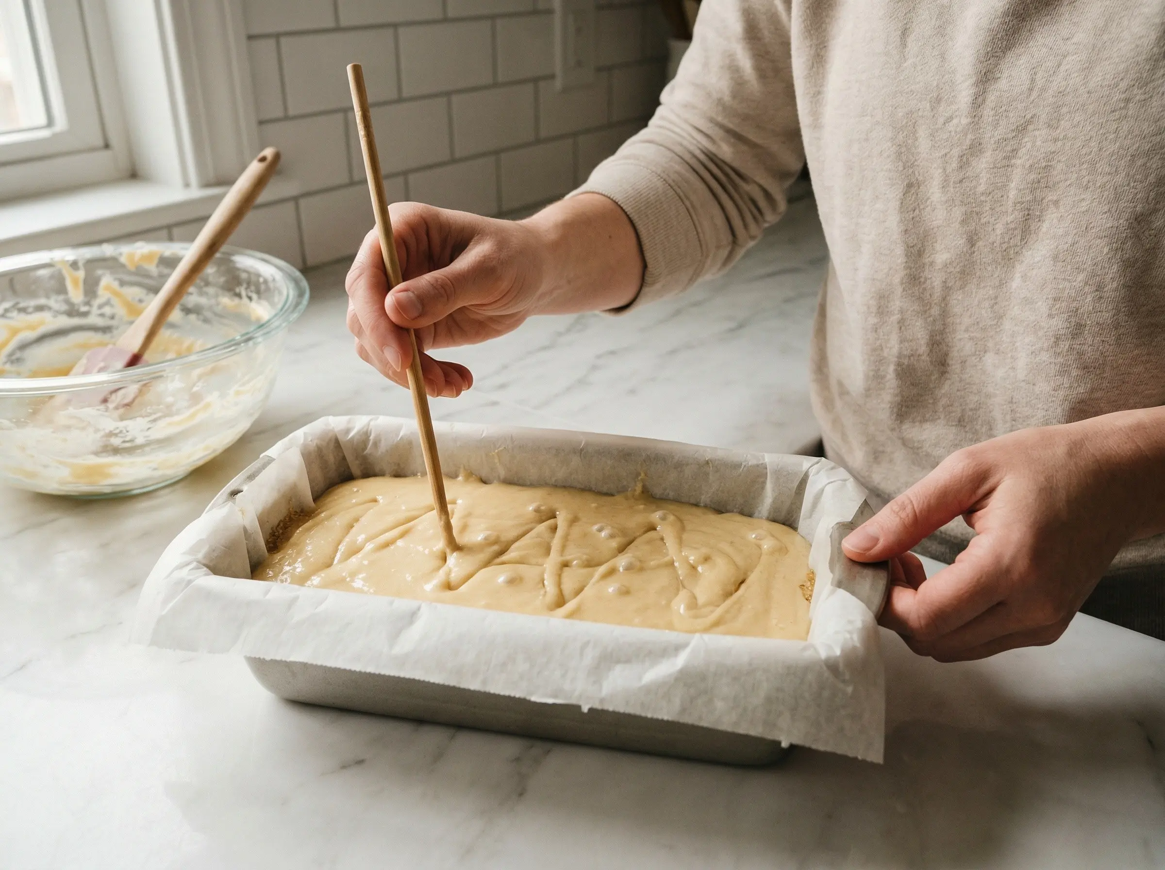 Pour and prepare for baking. Sprinkle the additional 2 tablespoons of sugar evenly over the bottom of the prepared pan - this will caramelize to form the characteristic castella bottom layer. Slowly pour the batter into the prepared pan from a height of about 6 inches - this helps remove large air bubbles. Use a chopstick or skewer to run through the batter in zigzag patterns to pop any remaining large bubbles. Gently tap the pan on the counter several times to release air bubbles and level the surface.