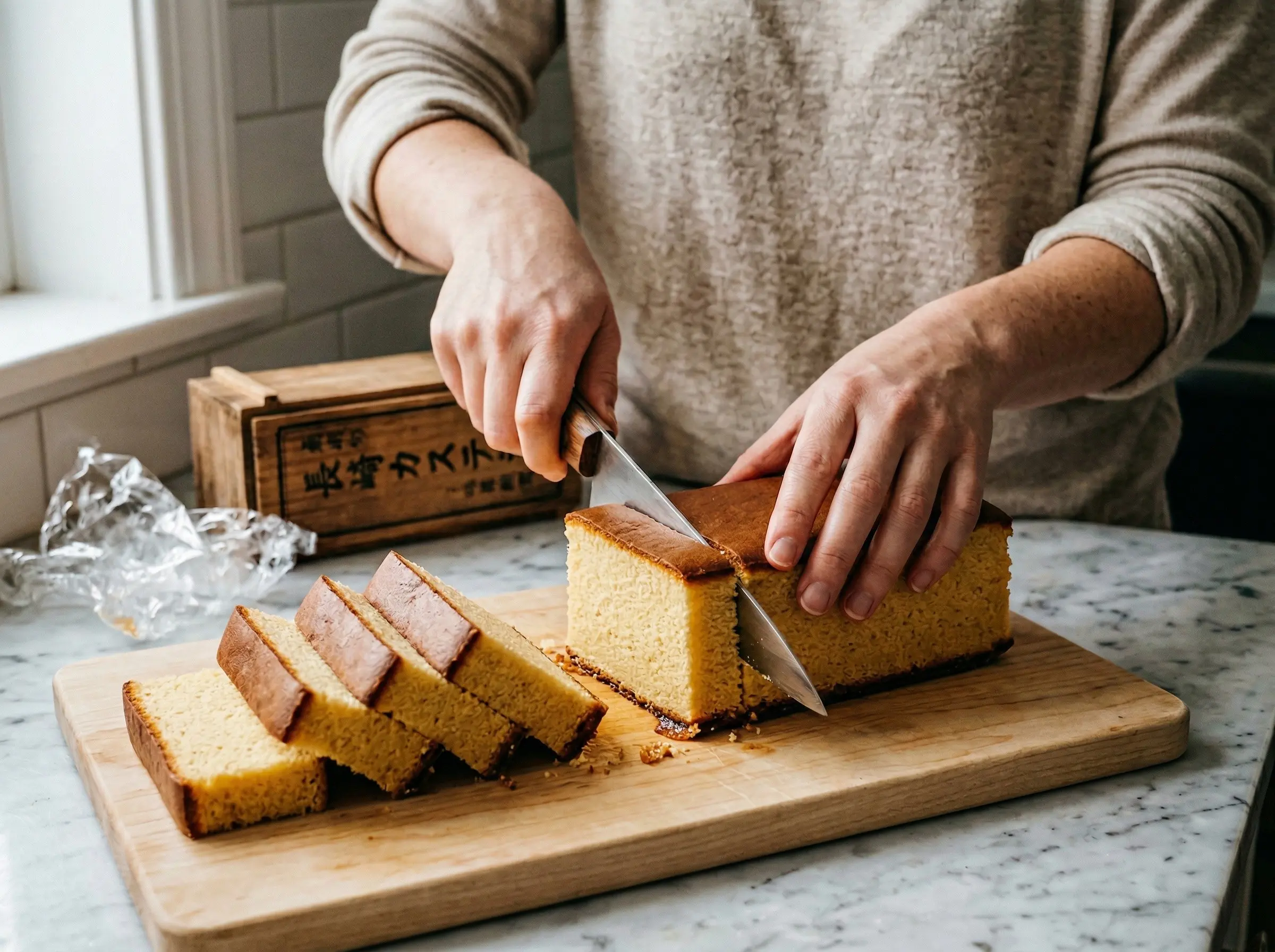 Bake with care and patience. Bake at 325 degrees F for 50-60 minutes until a skewer inserted in the center comes out clean and the top springs back when gently pressed. The top should be deep golden brown. If the top browns too quickly, tent loosely with aluminum foil for the last 15-20 minutes. Traditional castella is baked low and slow to achieve its even crumb. Remove from the oven and immediately drop the pan from a height of about 6 inches onto the counter - this shock prevents the cake from shrinking. Let cool in the pan for 10 minutes, then lift out using the parchment paper overhang. Wrap the cake tightly in plastic wrap while still slightly warm - this traps moisture and creates the characteristic moist texture. Rest at room temperature for at least 12 hours, preferably 24 hours, before slicing. The resting period allows moisture to distribute evenly throughout the cake. Trim the edges for the cleanest presentation, then slice into elegant rectangles about 1 inch thick. Traditional castella is served plain, showcasing the perfect crumb and caramelized bottom. Store wrapped at room temperature for up to 5 days - the cake actually improves for the first 2-3 days as it becomes more moist.