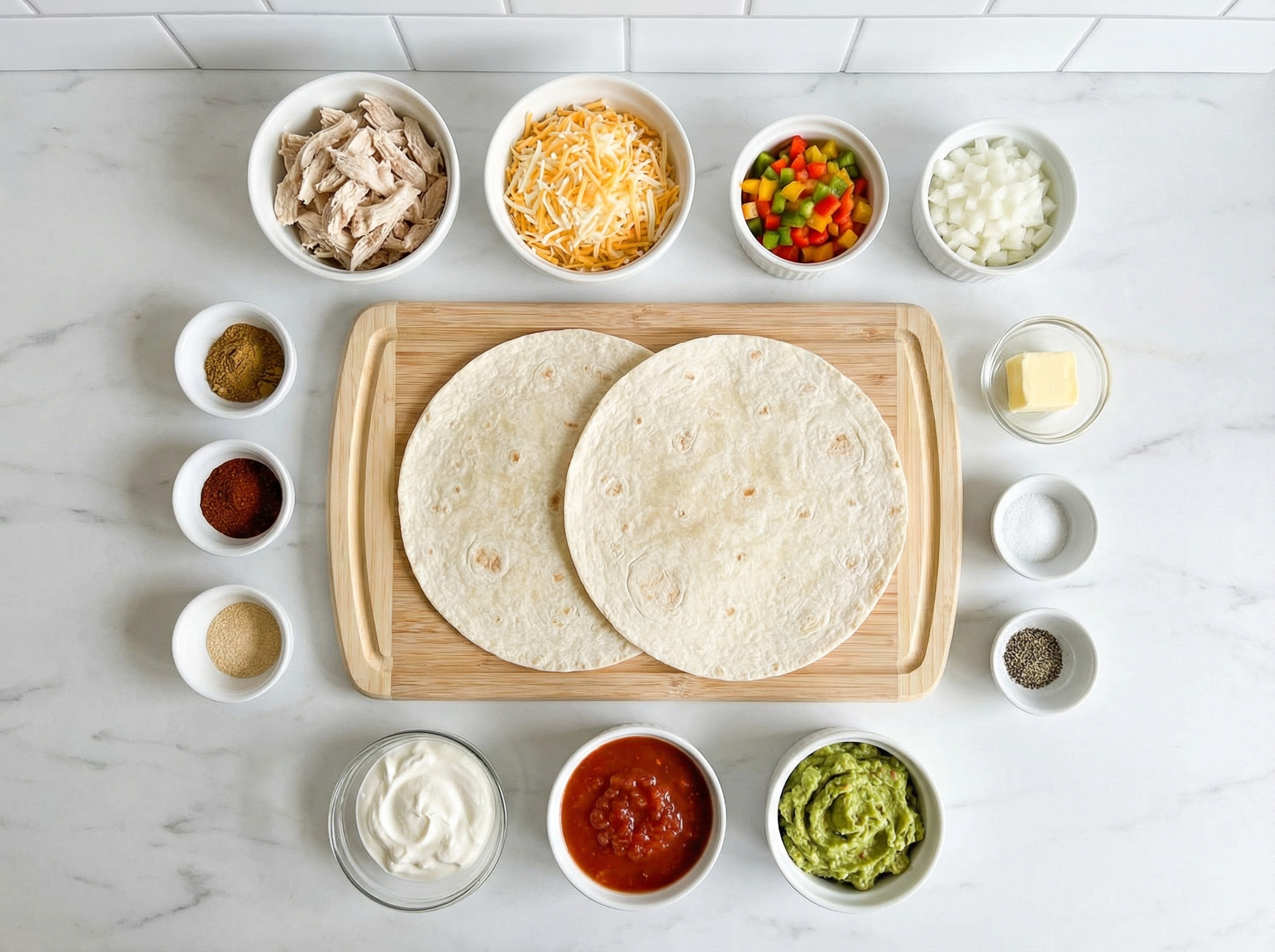Heat a large skillet or griddle over medium heat. While the pan is heating, prepare your quesadilla assembly. Lay one flour tortilla flat on a clean work surface. On one half of the tortilla, sprinkle about half of the cheese (this will act as the glue that holds everything together), then layer on half of the seasoned chicken, followed by half of the diced bell peppers and onions. Top with the remaining portion of cheese for that half, which will melt down and bind all the ingredients together. The cheese on top and bottom creates layers of melted goodness that keep the filling from falling out when you cut and eat the quesadilla.