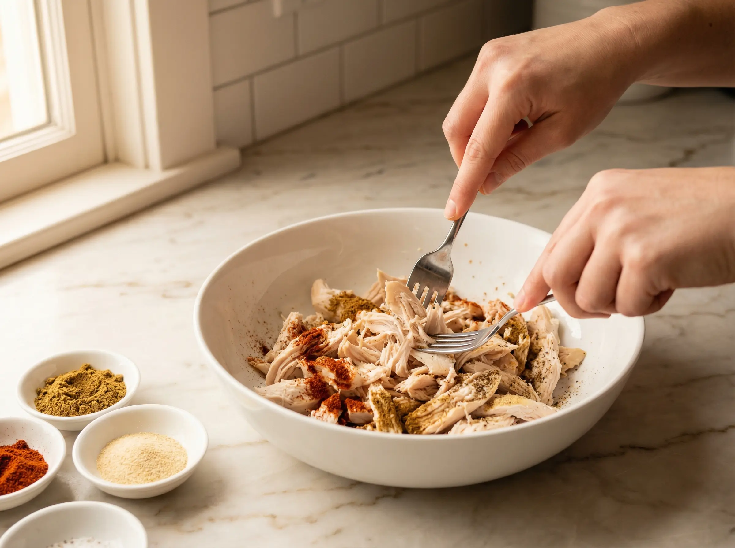 If using raw chicken, cook it first by seasoning chicken breasts with salt, pepper, cumin, chili powder, and garlic powder, then either pan-fry for 6-7 minutes per side until cooked through, or bake at 375°F for 25-30 minutes. Let the chicken rest for 5 minutes, then shred it using two forks by pulling the meat apart along the natural grain. If using pre-cooked rotisserie chicken, simply shred it and toss with the spices. In a bowl, combine the shredded chicken with the cumin, chili powder, garlic powder, salt, and pepper, mixing well to ensure every piece is evenly coated with the seasoning blend.