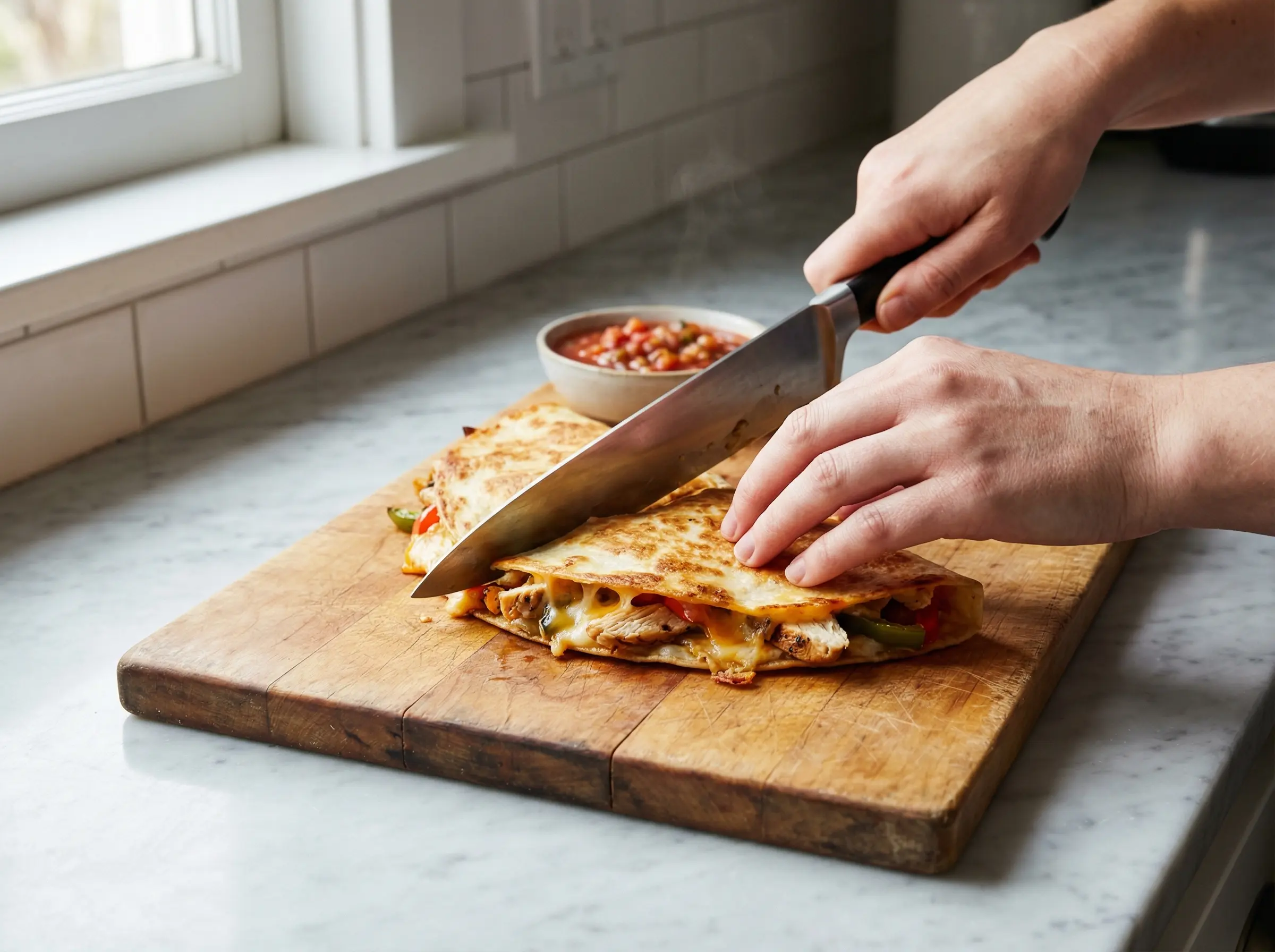 Using a sharp knife or pizza cutter, cut the quesadilla into 3-4 wedges, similar to cutting a pizza. For the cleanest cuts, use a rocking motion with your knife rather than a sawing motion. The brief resting period before cutting allows the cheese to set slightly, preventing all the filling from oozing out when you slice. Repeat the entire process with the second tortilla and remaining ingredients if making multiple quesadillas.