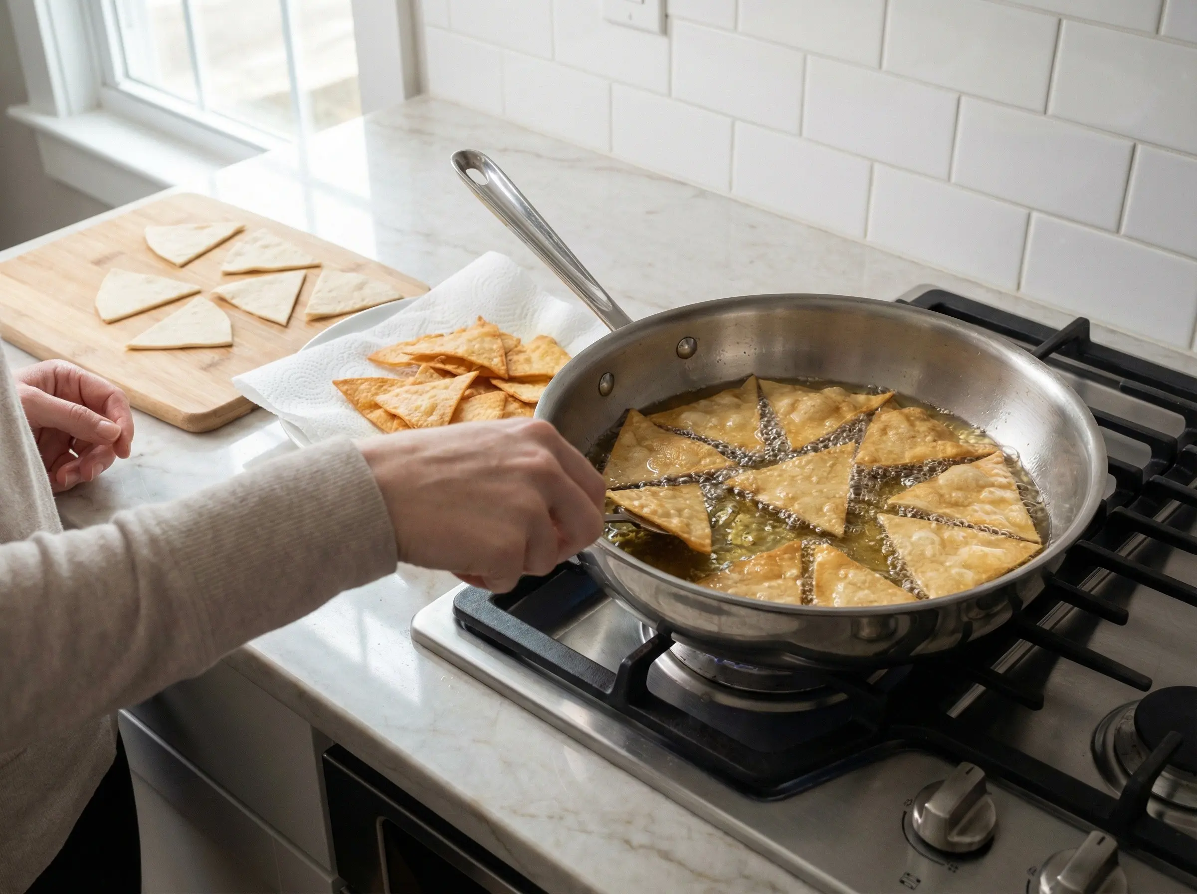 If using fresh corn tortillas, cut them into quarters or sixths to create triangular chips. If the tortillas are fresh and pliable, let them sit out uncovered for 30 minutes to an hour to dry out slightly - this helps them crisp up better when fried and prevents them from becoming too soggy in the salsa. Alternatively, you can use store-bought tortilla chips to save time, though homemade chips taste better and are more traditional. Heat the vegetable oil in a large, deep skillet over medium-high heat. Once the oil is hot and shimmering (about 350 degrees F), add the tortilla pieces in batches - do not overcrowd the pan. Fry for 2-3 minutes, turning occasionally, until golden brown and crispy. They should be crunchy but not overly hard or burnt. Use a slotted spoon to transfer the fried chips to a paper towel-lined plate to drain. Sprinkle lightly with salt while still hot. Repeat with remaining tortilla pieces.