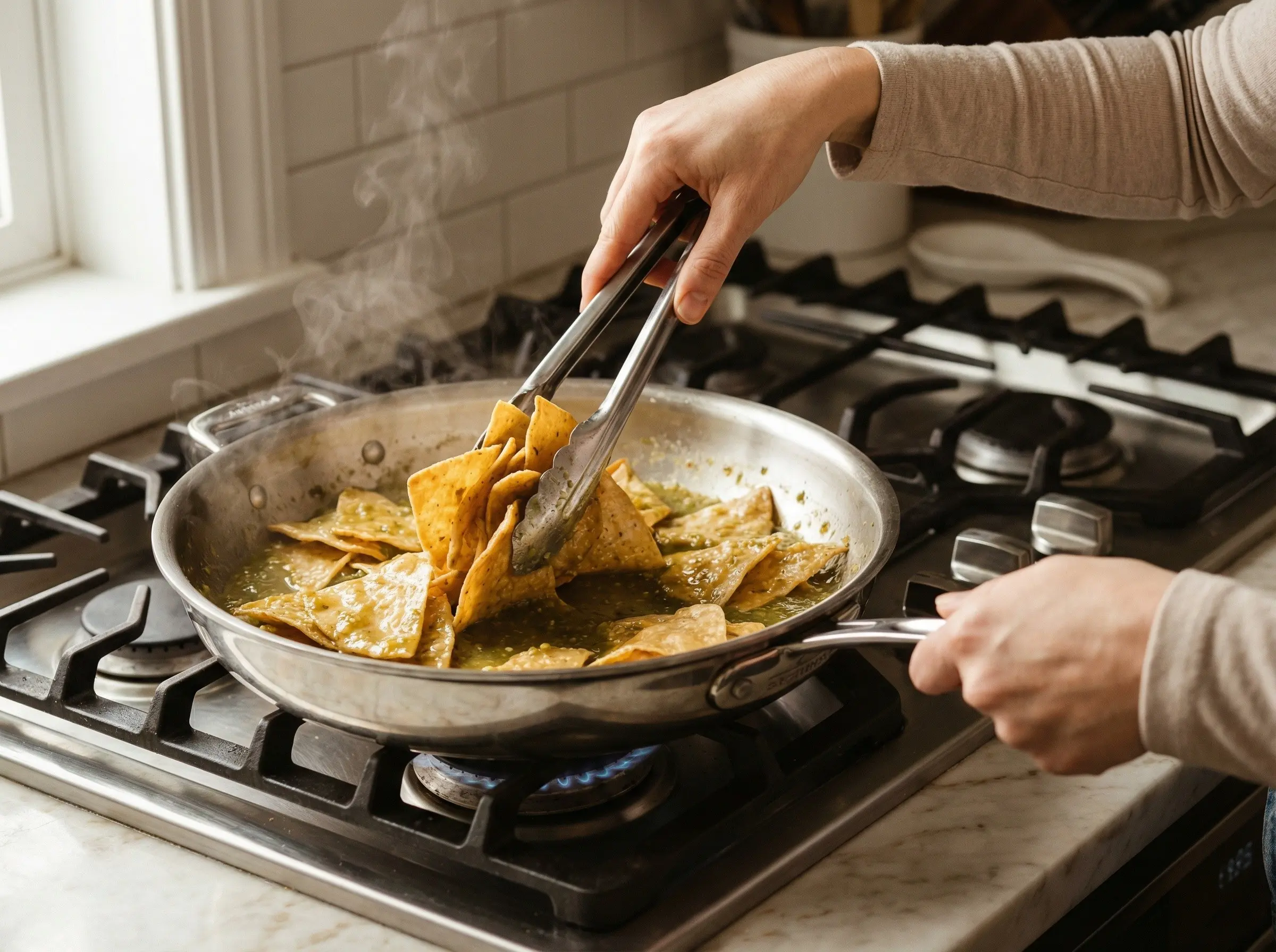 This is the critical moment that makes or breaks chilaquiles. Add the fried tortilla chips to the hot salsa all at once. Using tongs or a large spoon, toss the chips in the salsa to coat them evenly. The key is timing - you want to coat the chips and let them absorb some sauce, but not let them sit so long that they become completely soggy. Toss and cook for about 1-2 minutes, just until the chips are softened on the outside but still have some crunch in the center. In Mexico, this perfect texture is described as chips that are suavecitos (softened) but not empapados (soaked through). If you prefer softer chilaquiles, let them simmer a minute longer. If you like them crunchier, serve immediately. Remove from heat - the chips will continue to soften from the residual heat.