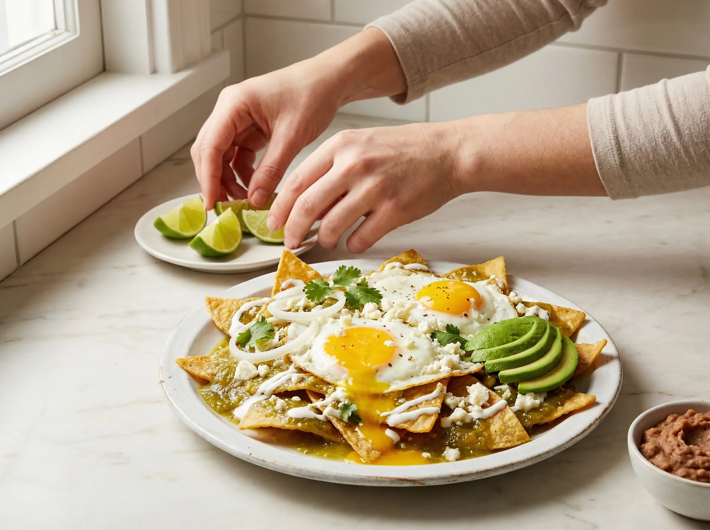 Serve the chilaquiles immediately while still warm, with lime wedges on the side for squeezing over the top. The lime juice adds brightness and acidity that cuts through the richness of the eggs and crema. Traditionally, chilaquiles are served with refried beans on the side for a complete breakfast. Some people also like to serve them with additional salsa, pickled jalapeños, or Mexican hot sauce for those who want extra heat. The key to enjoying chilaquiles is to eat them right away - they are meant to be consumed fresh while the chips still have some texture. As you eat, break the egg yolk and let it run over the chips, creating an additional creamy sauce. The combination of crispy-soft chips, runny egg yolk, cool crema, salty cheese, and fresh toppings is what makes chilaquiles such a beloved dish. Any leftovers will become very soft as the chips continue to absorb liquid, so chilaquiles are best made fresh to order.