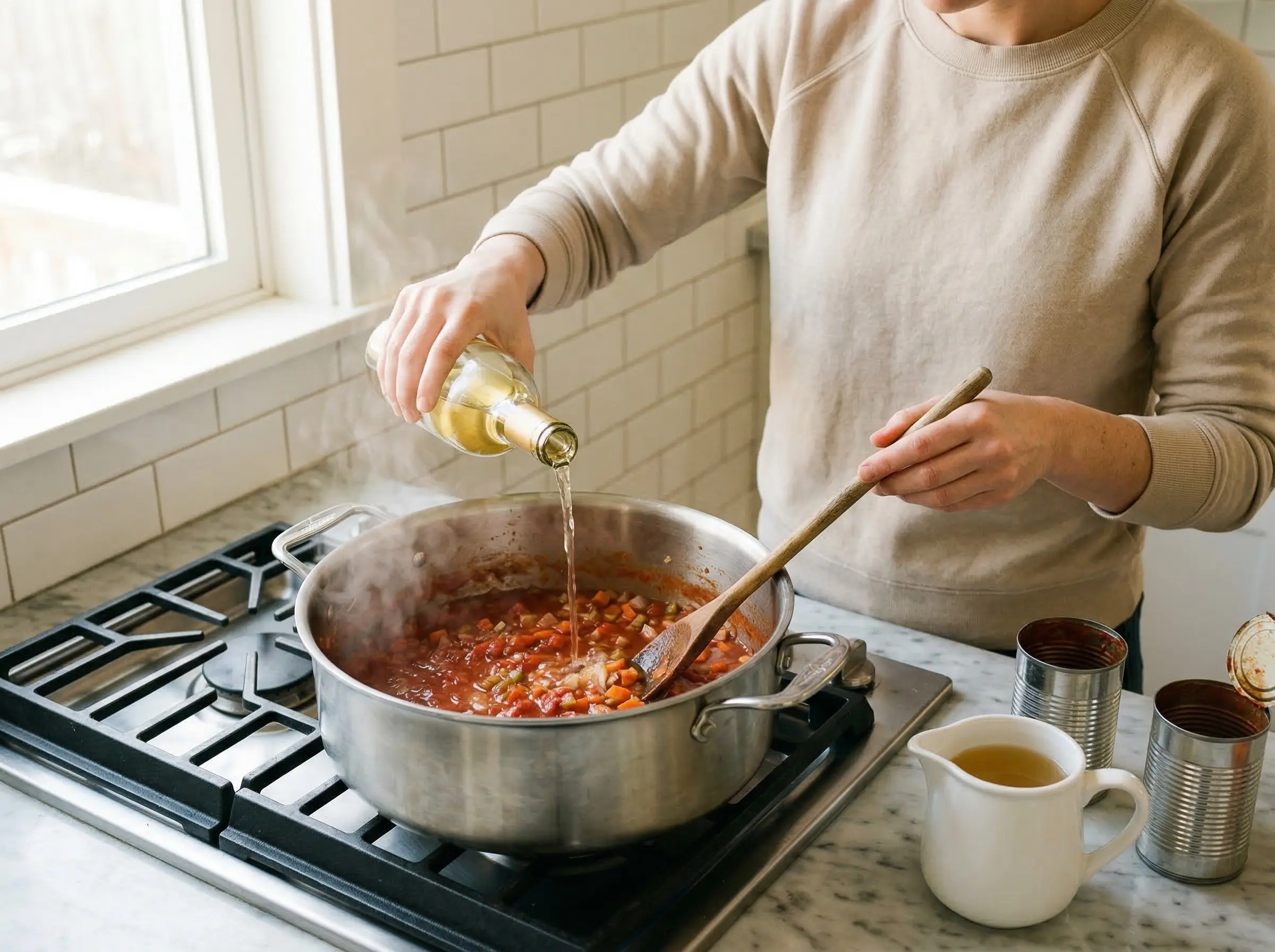Create the tomato-wine broth. Add the crushed tomatoes, diced tomatoes, white wine, fish stock, bay leaves, oregano, dried basil, salt, and pepper. Stir well and bring to a boil. Reduce heat and simmer uncovered for 20-25 minutes, allowing the flavors to meld and the broth to reduce slightly. The broth should taste bright from the tomatoes, with good wine acidity and depth from the stock. Taste and adjust seasoning - the broth is the foundation, so it should be well-seasoned before adding seafood.