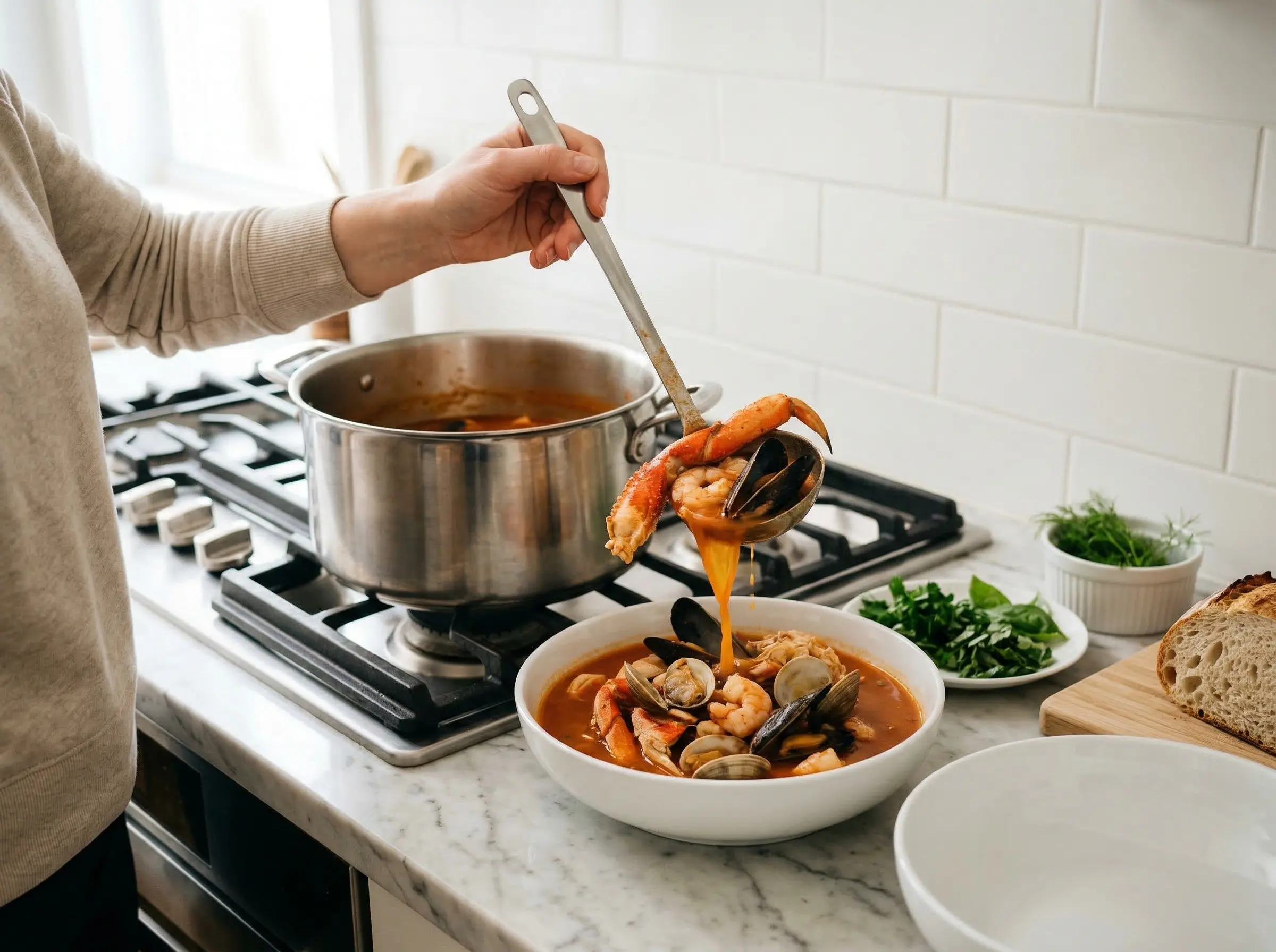 Finish and serve. Remove the bay leaves. Gently stir in the fresh parsley and basil, reserving some for garnish. Taste the broth one final time and adjust seasoning if needed. Ladle the cioppino into large, deep bowls, ensuring each serving has a generous variety of seafood and plenty of broth. Garnish with remaining herbs and reserved fennel fronds. Serve immediately with thick slices of crusty sourdough bread for sopping up every drop of the precious broth. Provide empty bowls for shells, plenty of napkins, and seafood crackers for the crab if needed. Cioppino is meant to be eaten with your hands - crack the crab shells, dip the bread, slurp the mussels from their shells. It is a joyful, messy, communal meal. The broth can be made a day ahead and refrigerated; reheat and add seafood just before serving.