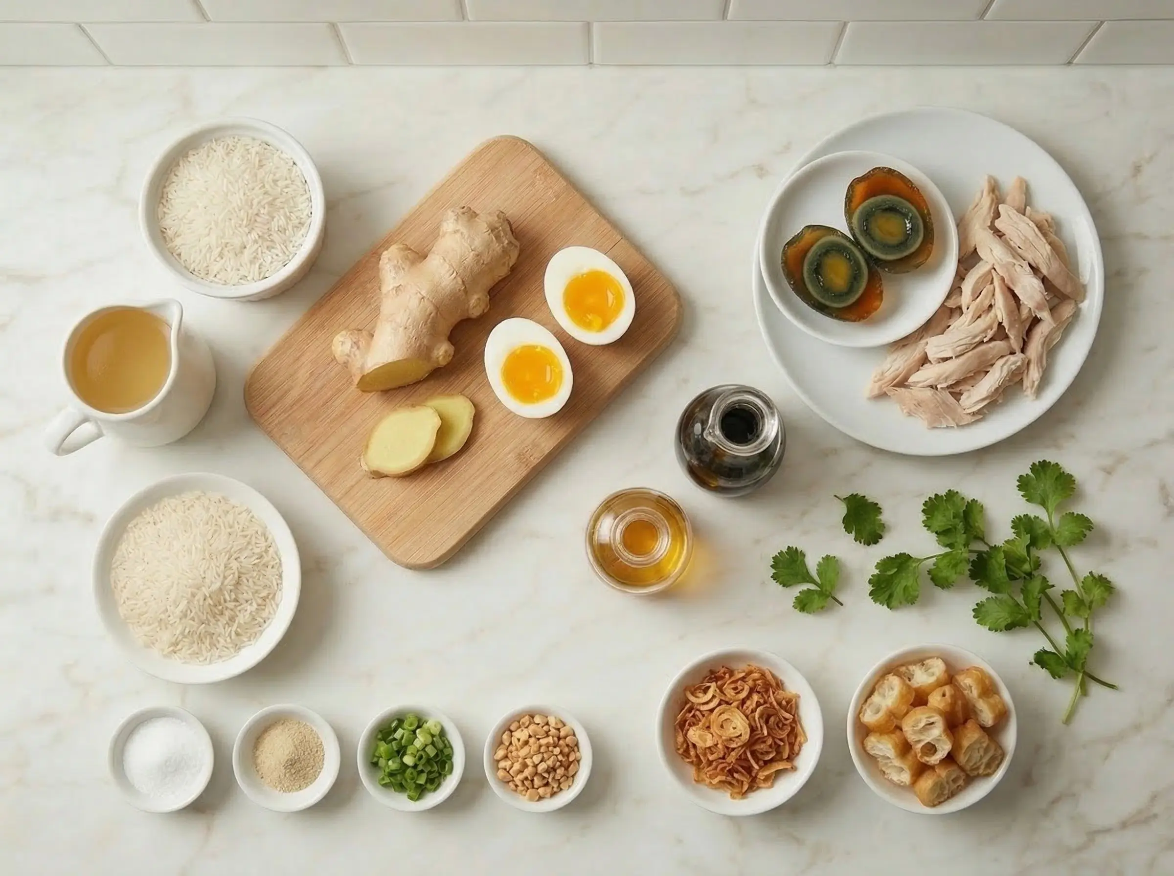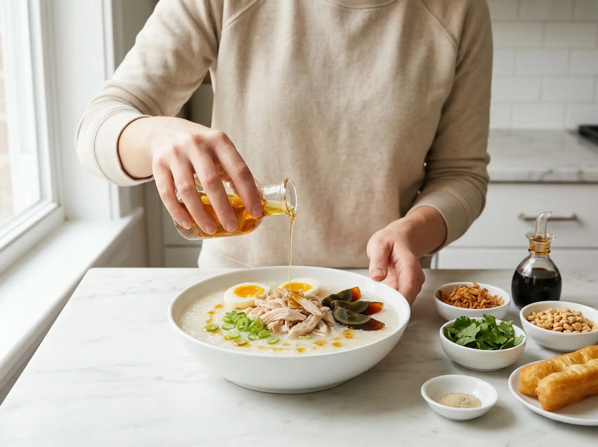 Optional: add protein while cooking. For chicken congee, add bone-in chicken thighs or a whole chicken leg to the pot during the last 30-40 minutes of cooking. The chicken will poach gently in the porridge, and the bones add extra body. Remove, shred the meat, and serve on top. For pork and century egg congee (the Cantonese classic), add strips of marinated pork or pork meatballs during the last 15 minutes. Fish congee adds delicate fish slices in the final minutes, cooking just until opaque.