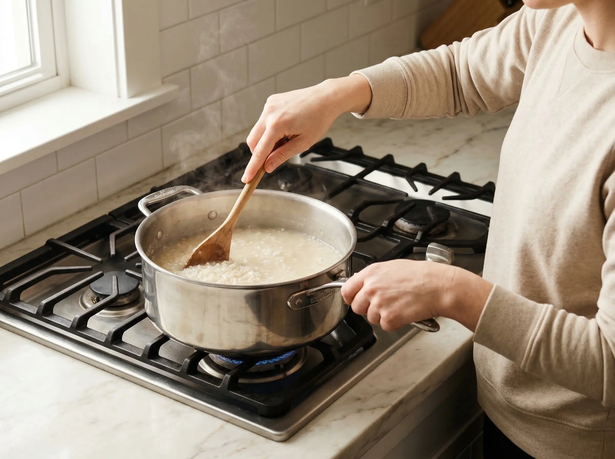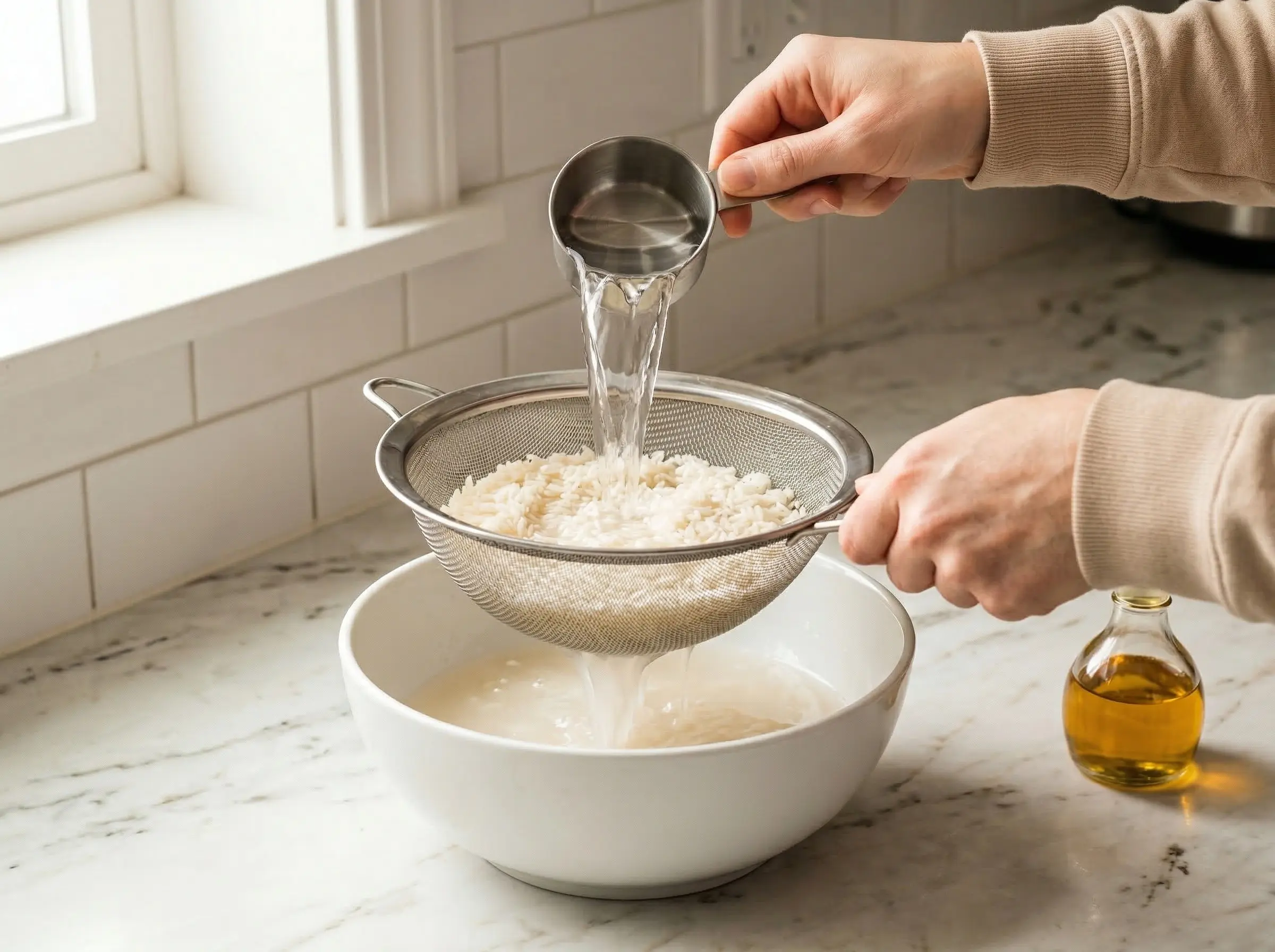 Prepare the rice. Rinse the rice in several changes of cold water until the water runs mostly clear - this removes excess surface starch for a cleaner-tasting congee. Drain well. For faster cooking and silkier texture, you can soak the rice for 30 minutes to overnight, or freeze the rinsed rice for at least 2 hours - freezing breaks down the grain structure and speeds cooking significantly. For extra silkiness, toss the rinsed rice with 1 tablespoon of oil - this helps the grains break down more smoothly.