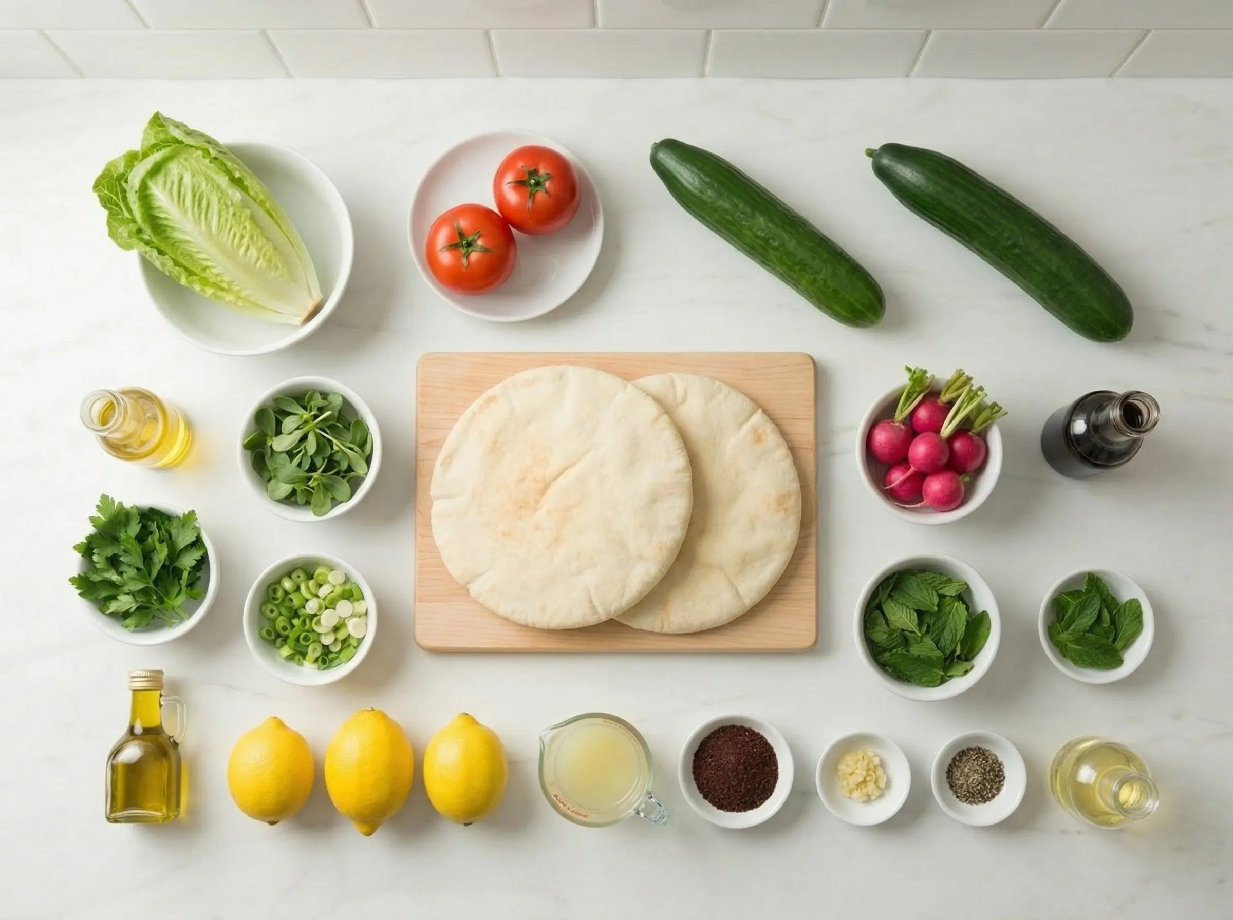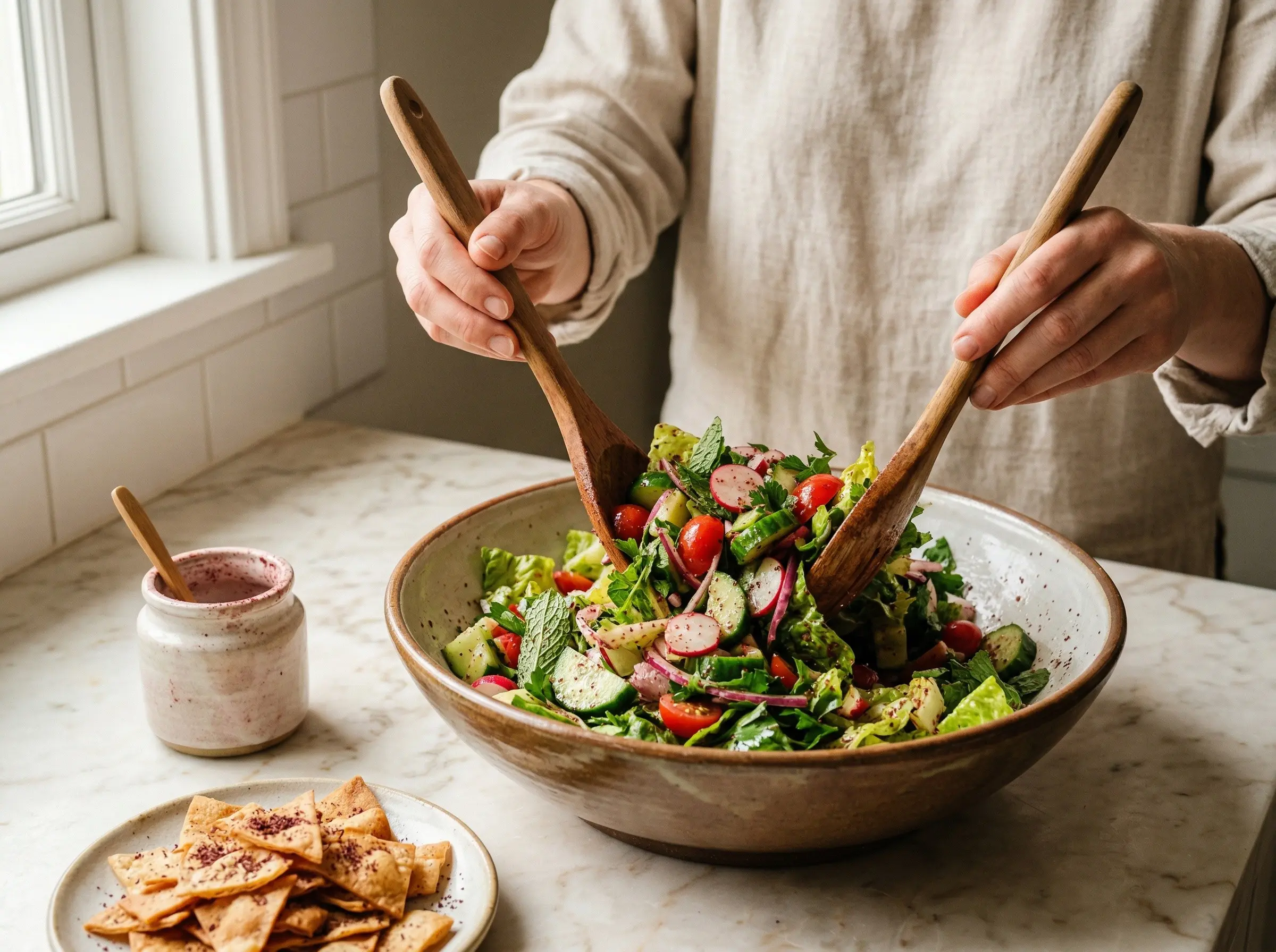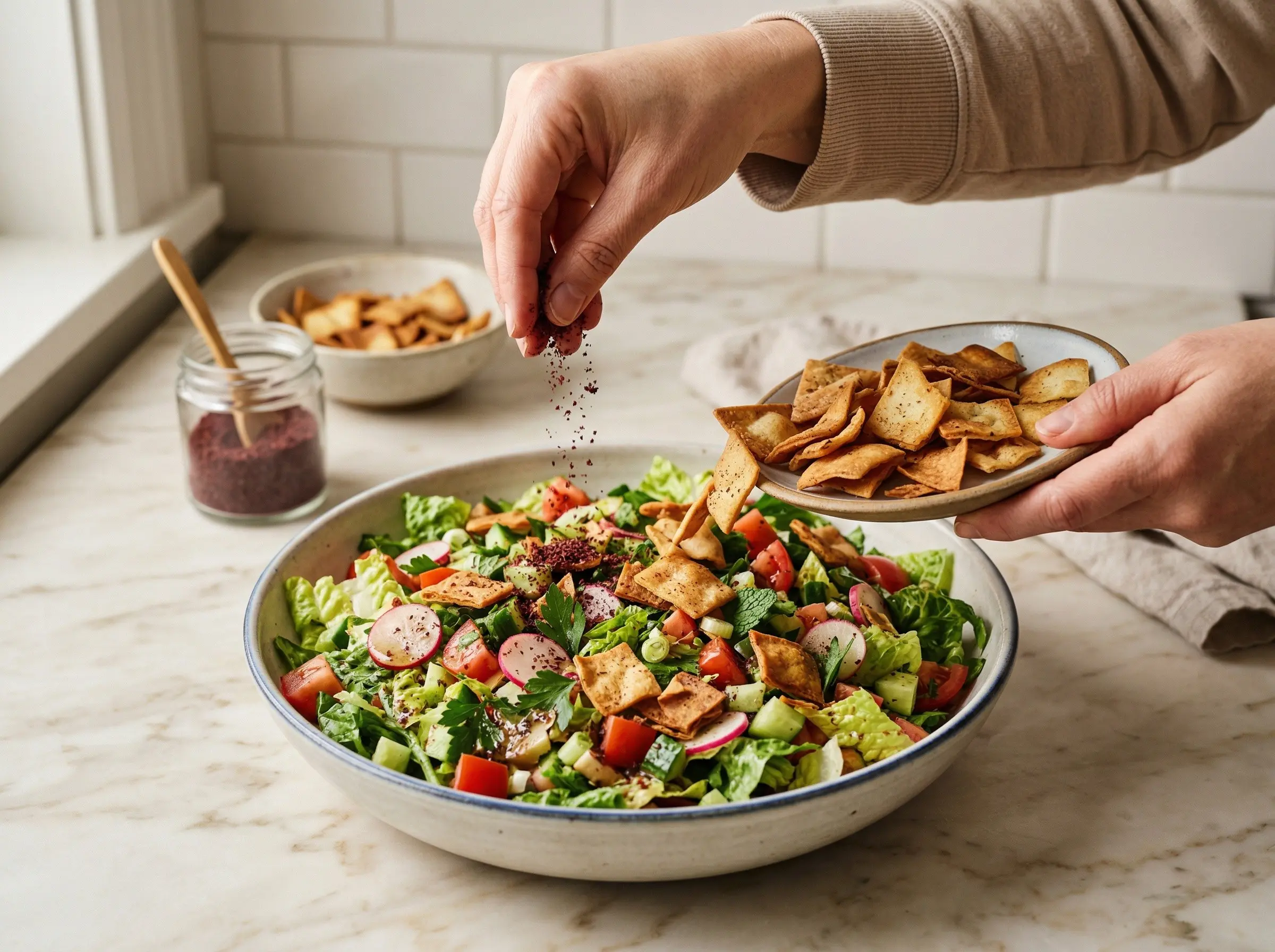 Fattoush is one of the great salads of the Levantine kitchen, a vibrant celebration of fresh vegetables, crispy fried or toasted pita bread, and a tangy sumac-lemon dressing that has been a staple of Lebanese, Syrian, Palestinian, and Jordanian tables for generations. The name "fattoush" derives from the Arabic word "fatt," meaning to break or crumble bread, reflecting the dish's origins as a clever way to use up stale flatbread rather than waste it. This tradition of transforming day-old bread into delicious dishes is found throughout the Mediterranean - Italian panzanella, Spanish gazpacho, and Middle Eastern fattoush all share this resourceful philosophy. Fattoush is particularly associated with the holy month of Ramadan, when the refreshing salad is served at iftar meals to break the daily fast. The combination of hydrating vegetables, tangy dressing, and crispy bread is especially welcome after a day without food or water. However, fattoush is enjoyed year-round in Lebanon and throughout the Middle East, appearing at family meals, restaurant tables, and mezze spreads. Each household has its own version - some add purslane (a tangy green vegetable traditional to Levantine cuisine), others include radishes, pomegranate seeds, or fresh mint. The one constant is the crispy pita and the sumac-laden dressing that gives fattoush its distinctive character. What makes fattoush so extraordinary is the interplay of textures and the bright, assertive flavor of sumac that ties everything together. Unlike tabbouleh, where parsley dominates, fattoush celebrates the full spectrum of fresh vegetables - crisp romaine, juicy tomatoes, crunchy cucumbers, sharp radishes, and aromatic herbs. The fried or toasted pita chips provide shatteringly crisp contrast that softens just slightly as they absorb the tangy dressing. And that dressing - built on sumac's fruity tartness, bright lemon juice, and grassy olive oil - is what elevates fattoush from a simple salad to something transcendent. Sumac, the ground dried berries of the sumac shrub, contributes a sour, almost citrusy flavor without the sharpness of lemon, creating a complexity that makes each bite compelling. Fattoush proves that the simplest ingredients, treated with respect and balanced carefully, can create dishes of remarkable sophistication.