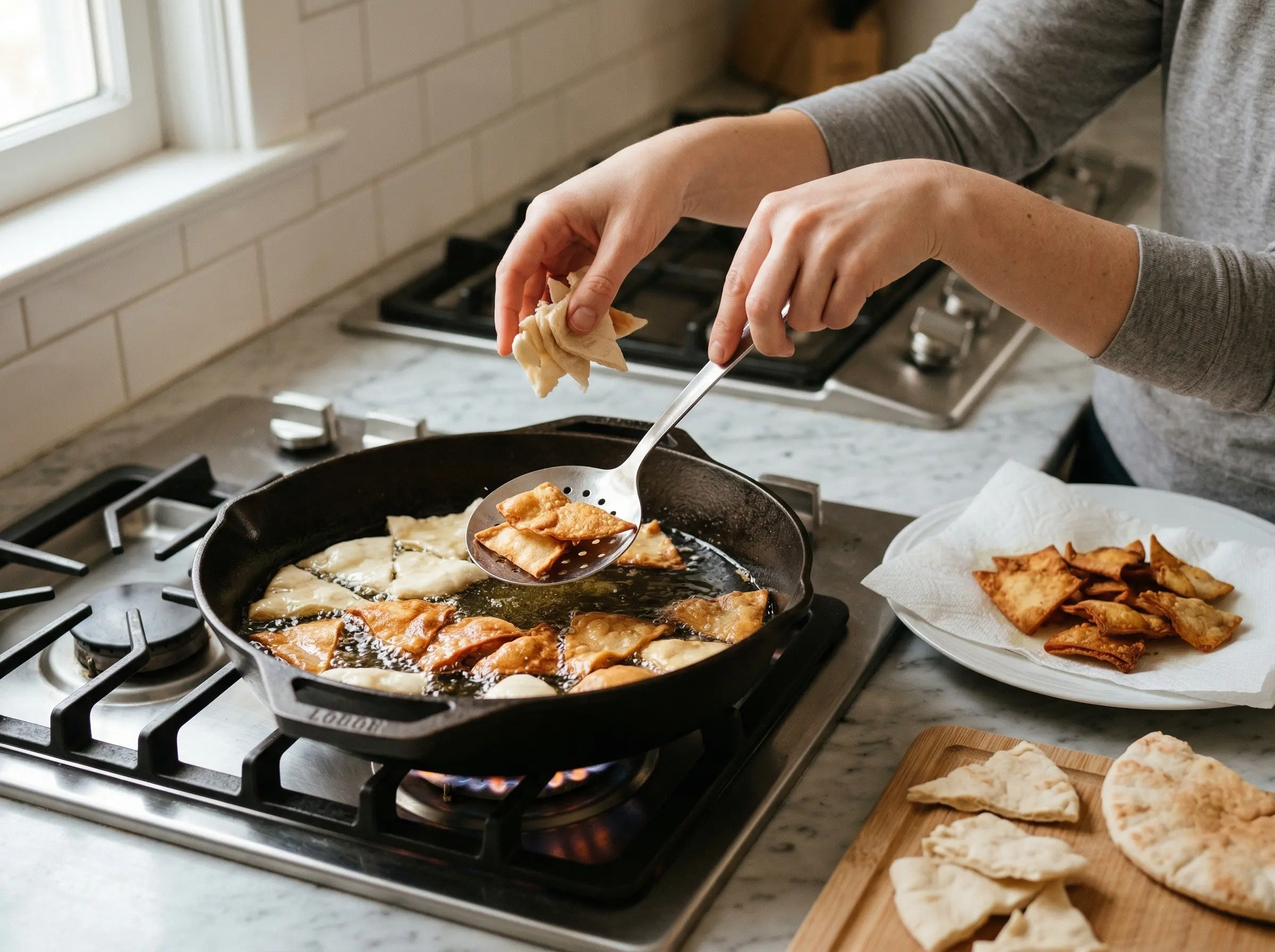 Prepare the pita chips. For the crispiest chips, fry the pita: cut or tear the pita bread into roughly 1-inch irregular pieces. Heat about 1/2 inch of vegetable oil in a skillet over medium-high heat until shimmering. Fry the pita pieces in batches for 1-2 minutes per side until deeply golden and crispy. Transfer to a paper towel-lined plate to drain and season immediately with a pinch of salt. For a lighter version, brush pita pieces with olive oil, spread on a baking sheet, and bake at 375 degrees F for 10-12 minutes until golden and crispy. The pita chips can be made ahead and stored in an airtight container for up to 3 days.
