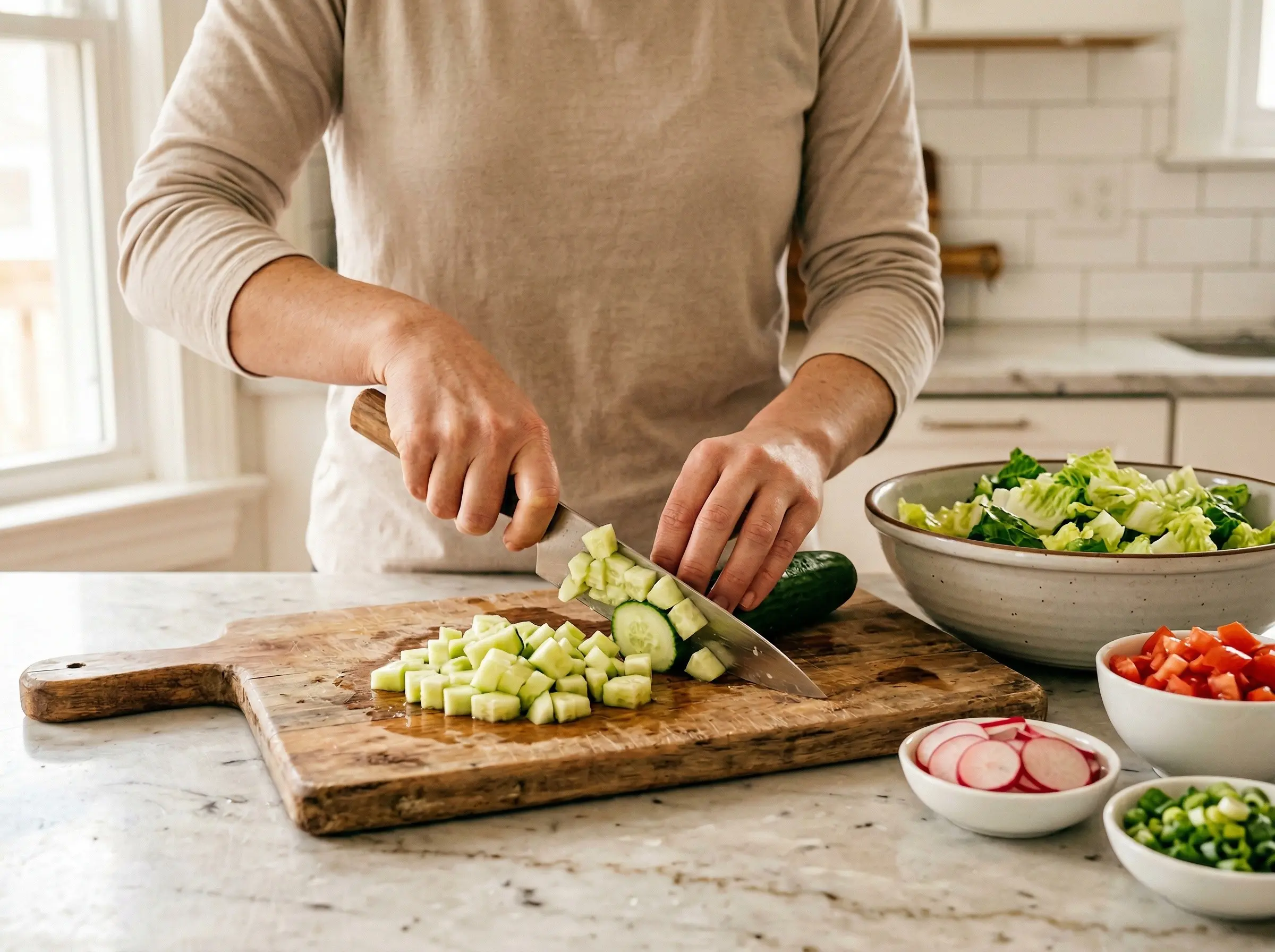 Prepare the vegetables. Chop the romaine lettuce into bite-sized pieces and place in a large salad bowl. Dice the tomatoes into 1/2-inch pieces, removing excess seeds if very juicy to prevent a watery salad. Dice the cucumber similarly - if using English cucumber, no need to peel or seed; if using regular cucumber, peel and seed it. Thinly slice the radishes into rounds. Slice the green onions. Add all vegetables to the bowl with the lettuce.