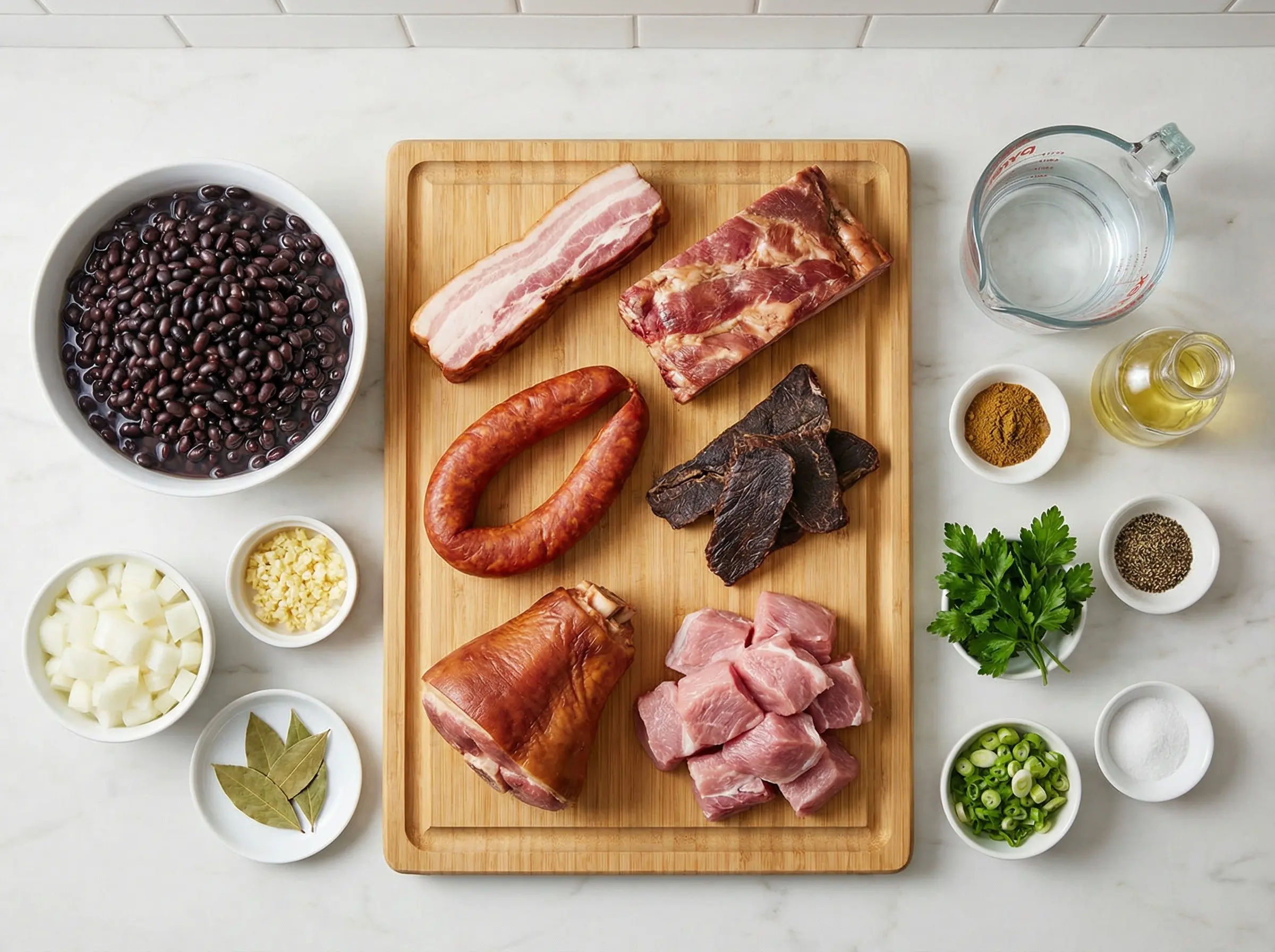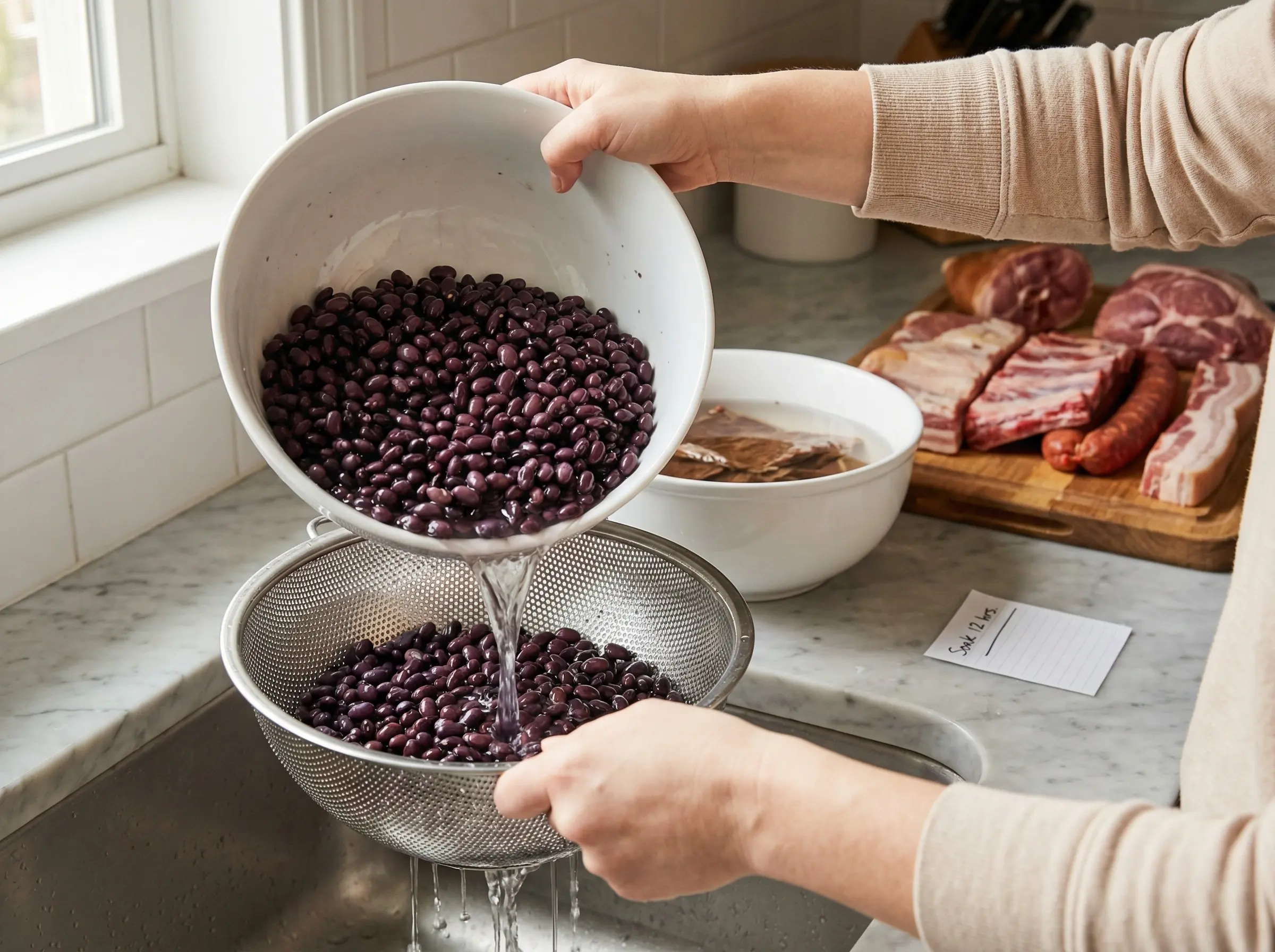 Prepare the beans and meats the night before. Place the dried black beans in a large bowl, cover with several inches of cold water, and soak overnight (at least 8 hours). The beans will double in size. If using carne seca (dried salted beef), soak it separately in cold water overnight as well, changing the water 2-3 times to remove excess salt. If your smoked meats are particularly salty, you can blanch them briefly in boiling water and discard the water to reduce saltiness. Drain the soaked beans and set aside.