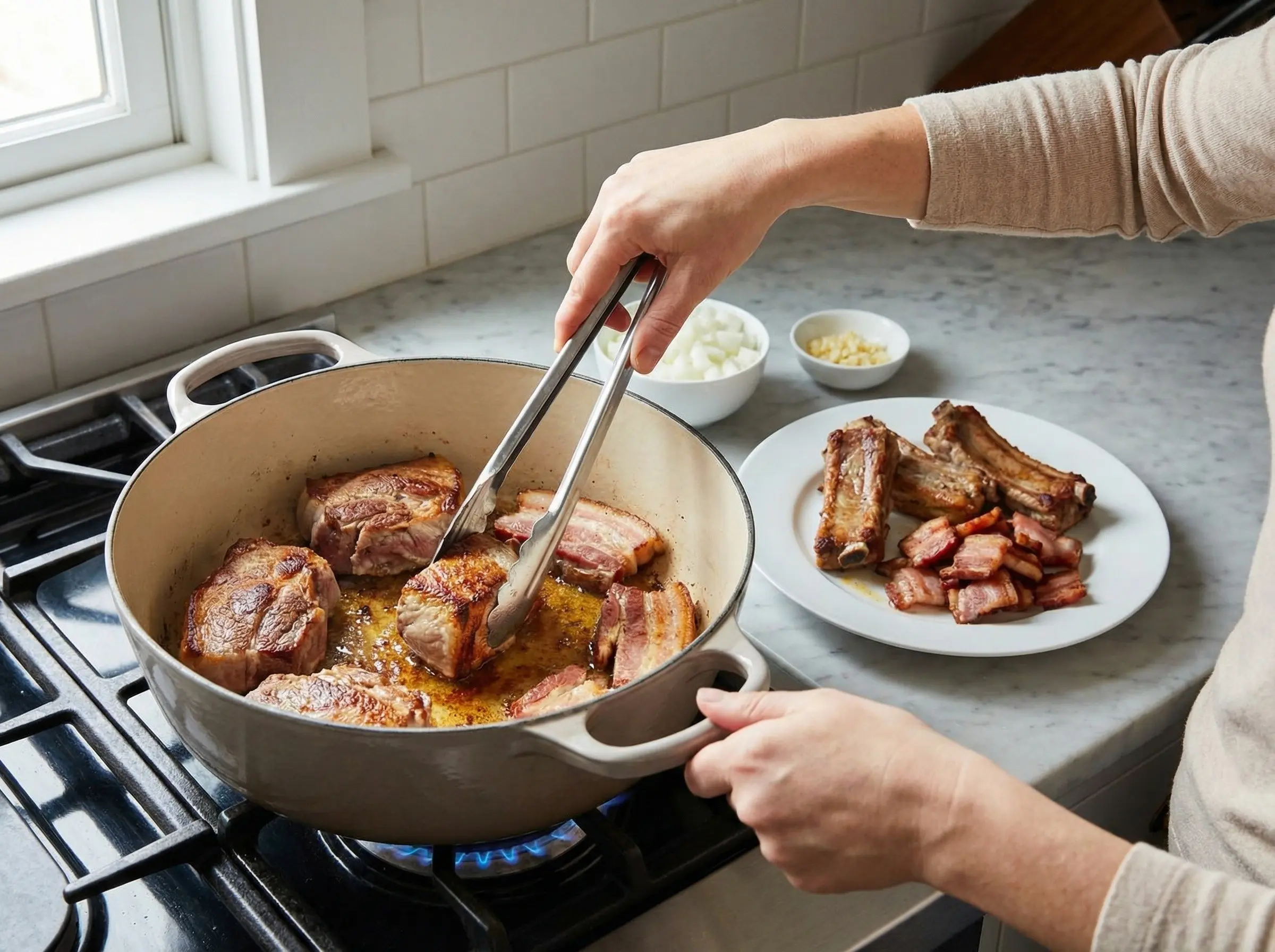 In a very large Dutch oven or heavy pot (at least 8 quarts), heat the vegetable oil over medium-high heat. Working in batches, brown the bacon, pork shoulder, and ribs on all sides, about 3-4 minutes per batch. This browning step builds tremendous flavor through the Maillard reaction. Transfer the browned meats to a plate. Add the diced onion to the pot and sauté in the rendered fat for 5-6 minutes until softened and golden. Add the minced garlic and cook for another minute until fragrant.