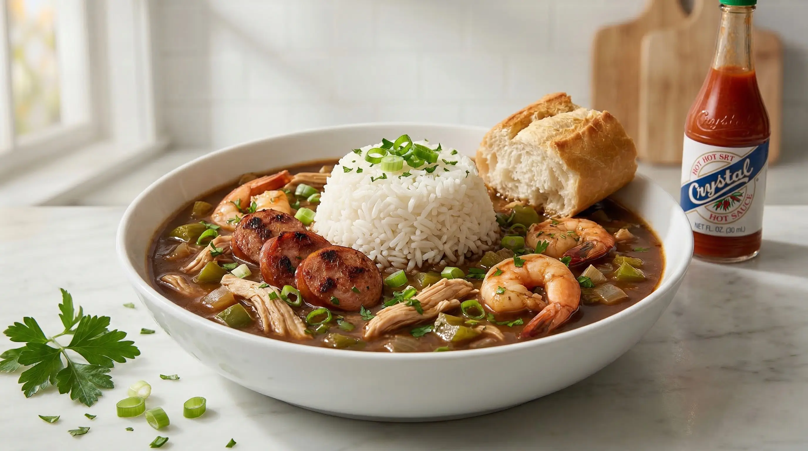 Add the shrimp and finish. Add the shrimp to the pot and cook for 3-5 minutes until pink and just cooked through - do not overcook or they will become rubbery. Remove from heat. If using filé powder, stir it in now - never add filé to boiling liquid or it will become stringy. Stir in half the sliced green onions and parsley. Let the gumbo rest for 10-15 minutes before serving - like most stews, gumbo improves as it sits. To serve, mound fluffy white rice in deep bowls and ladle the gumbo over and around the rice. Garnish with remaining green onions and parsley. Serve with hot sauce (Crystal or Louisiana are traditional) and crusty French bread for dipping. Gumbo tastes even better the next day as the flavors continue to develop. Store refrigerated for up to 4 days; reheat gently and add the shrimp fresh if possible.