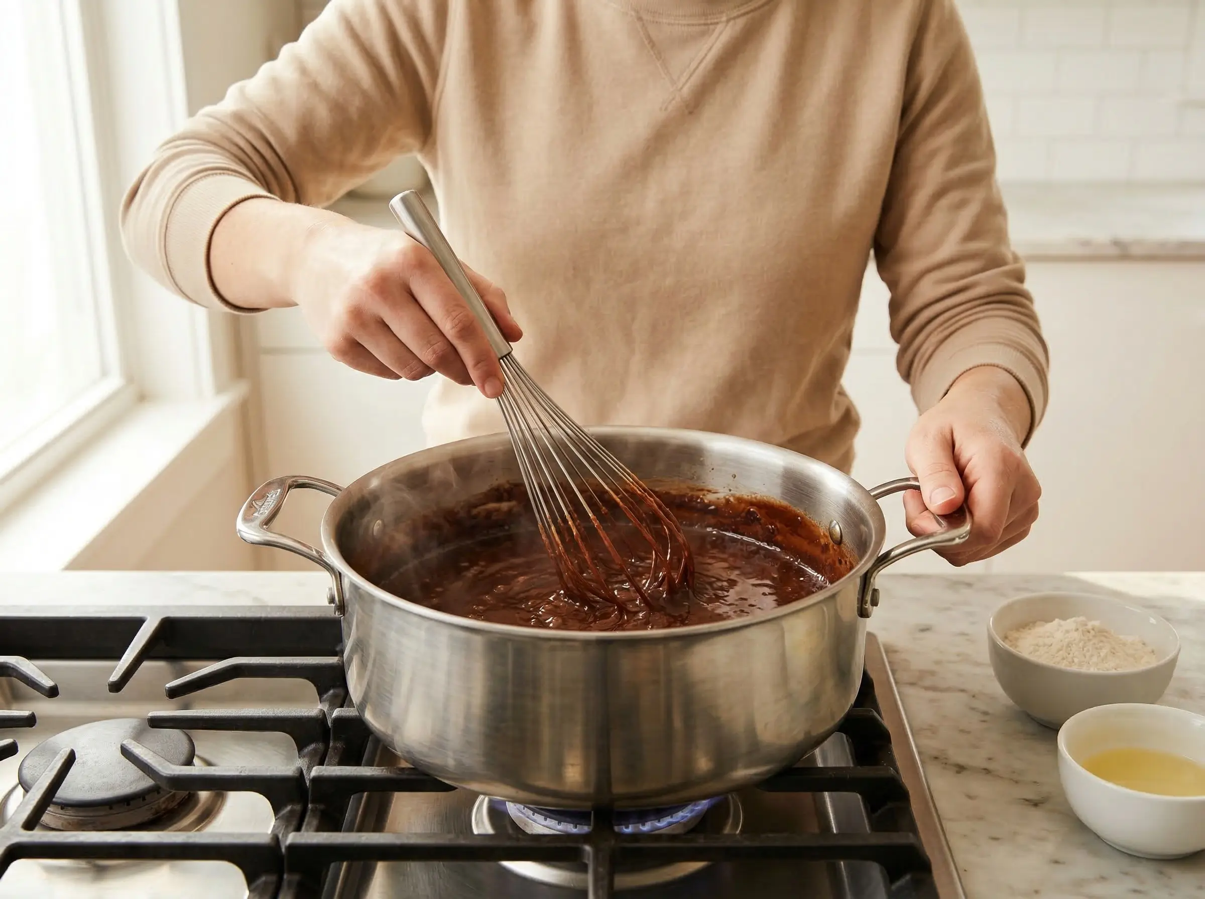 Make the roux - this is the soul of gumbo and cannot be rushed. In a large, heavy-bottomed Dutch oven or cast iron pot, heat the oil over medium heat. When shimmering, whisk in the flour until smooth. Now begins the patient work: cook the roux, whisking or stirring constantly, for 30-45 minutes. The roux will progress through stages - white, blonde, peanut butter, and finally dark chocolate. You must stir constantly to prevent burning - even a few seconds of neglect can create black specks that will ruin the gumbo with a bitter taste. The finished roux should be the color of dark chocolate or red brick and smell deeply nutty, almost like coffee. If you see black flecks or smell burning, discard and start over.