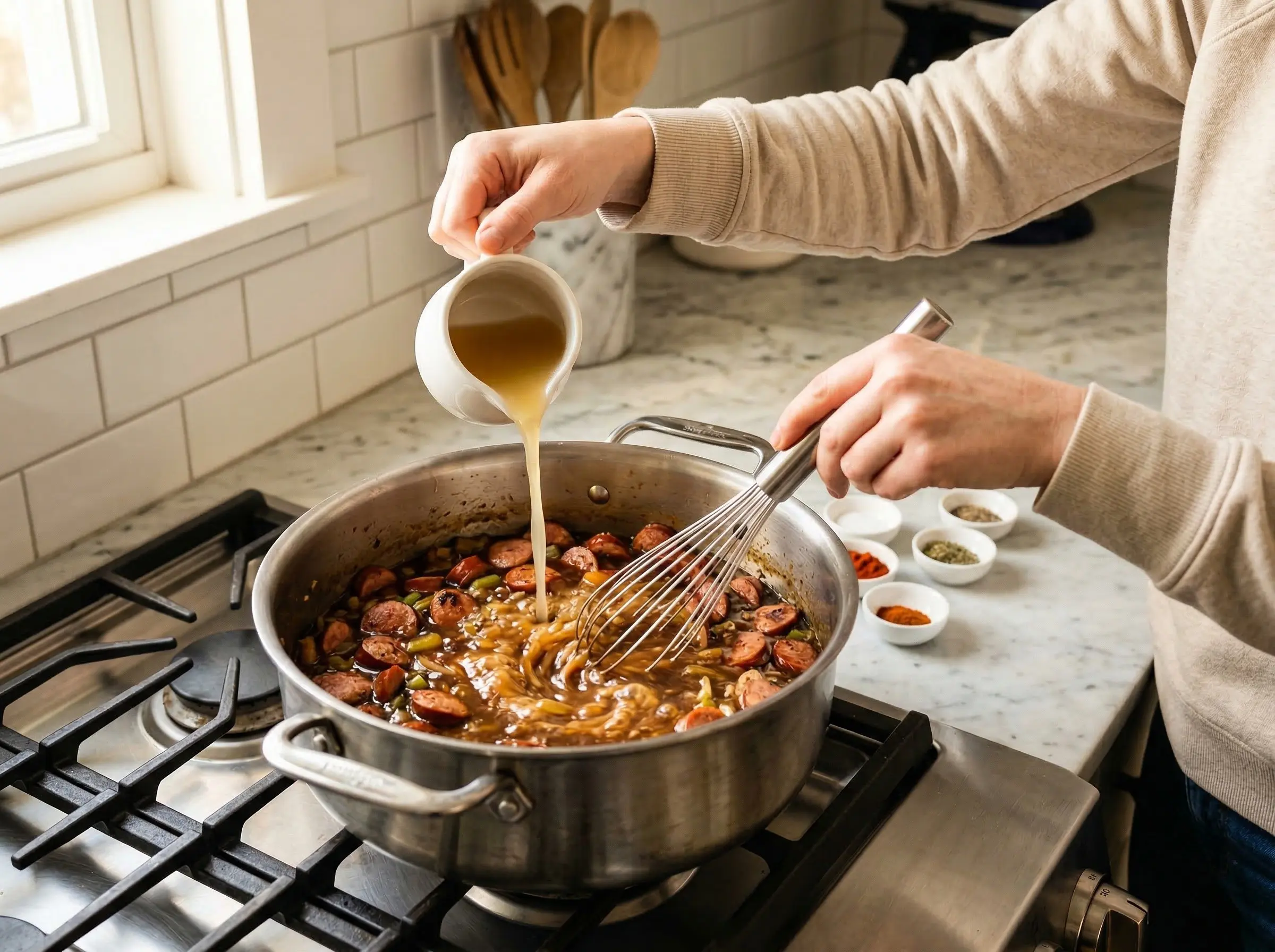 Build the stew base. Add the sliced andouille sausage and cook for 3-4 minutes until the edges begin to brown and the sausage releases its smoky fat. Slowly pour in the chicken stock, whisking constantly to incorporate the roux smoothly without lumps. Add the tomatoes if using (this makes it Creole-style; omit for Cajun-style). Add the bay leaves, thyme, smoked paprika, cayenne, salt, and black pepper. Bring to a boil, then reduce to a gentle simmer.