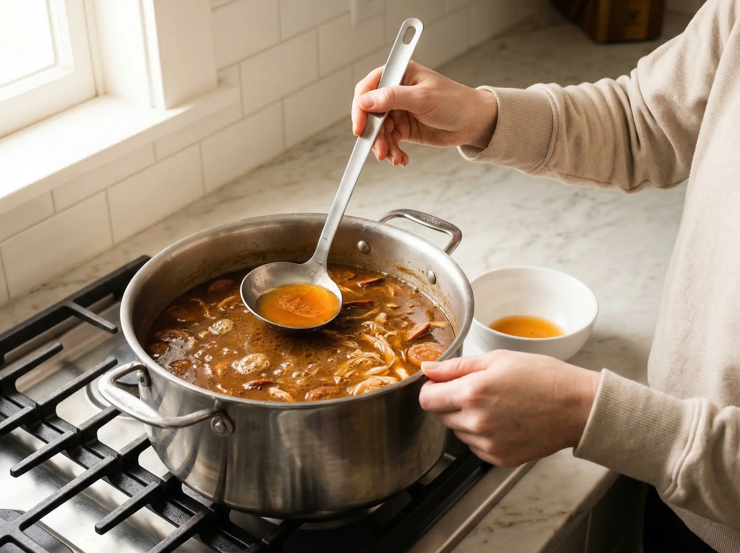 Simmer and develop flavors. Continue simmering the gumbo uncovered for another 20-30 minutes to allow the flavors to meld and the broth to thicken slightly. Skim any excess fat that rises to the surface. The gumbo should be thick enough to coat a spoon but still pourable - it will thicken further as it cools. Taste and adjust seasoning - gumbo should be well-seasoned and have a subtle heat that builds.