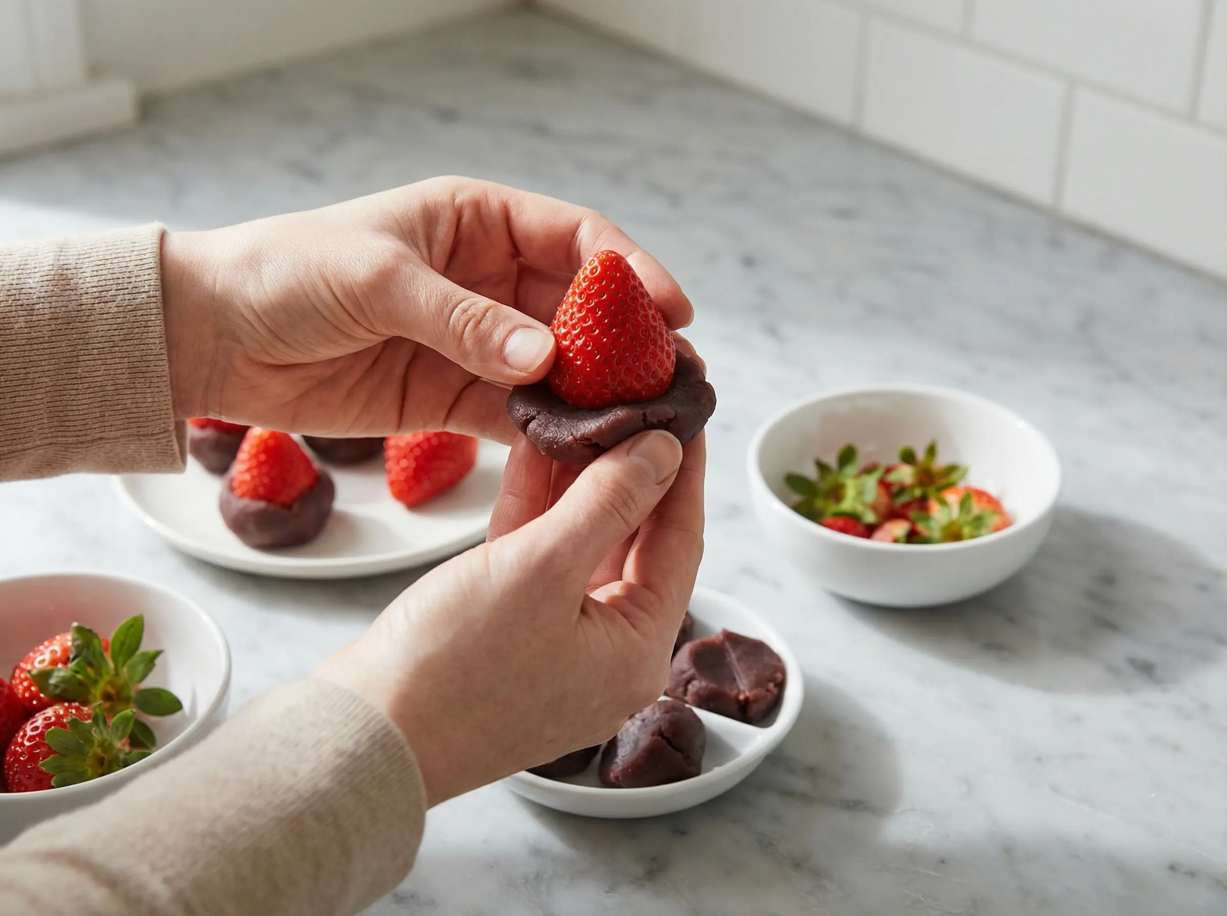 Prepare the strawberries and anko first. Wash the strawberries gently and pat them completely dry - any moisture will make the mochi soggy and prevent the anko from sticking properly. Hull the strawberries by removing the green tops and cutting out the white core. Choose strawberries that are similar in size, ripe but still firm, and as conical as possible for the most attractive final shape. Divide the red bean paste into 8 equal portions, about 1 tablespoon each. Flatten each portion into a thin disc in your palm, place a strawberry pointed-end up in the center, and wrap the anko around the strawberry, covering the bottom two-thirds while leaving the pointed tip exposed. The anko layer should be thin and even. Set the wrapped strawberries aside.