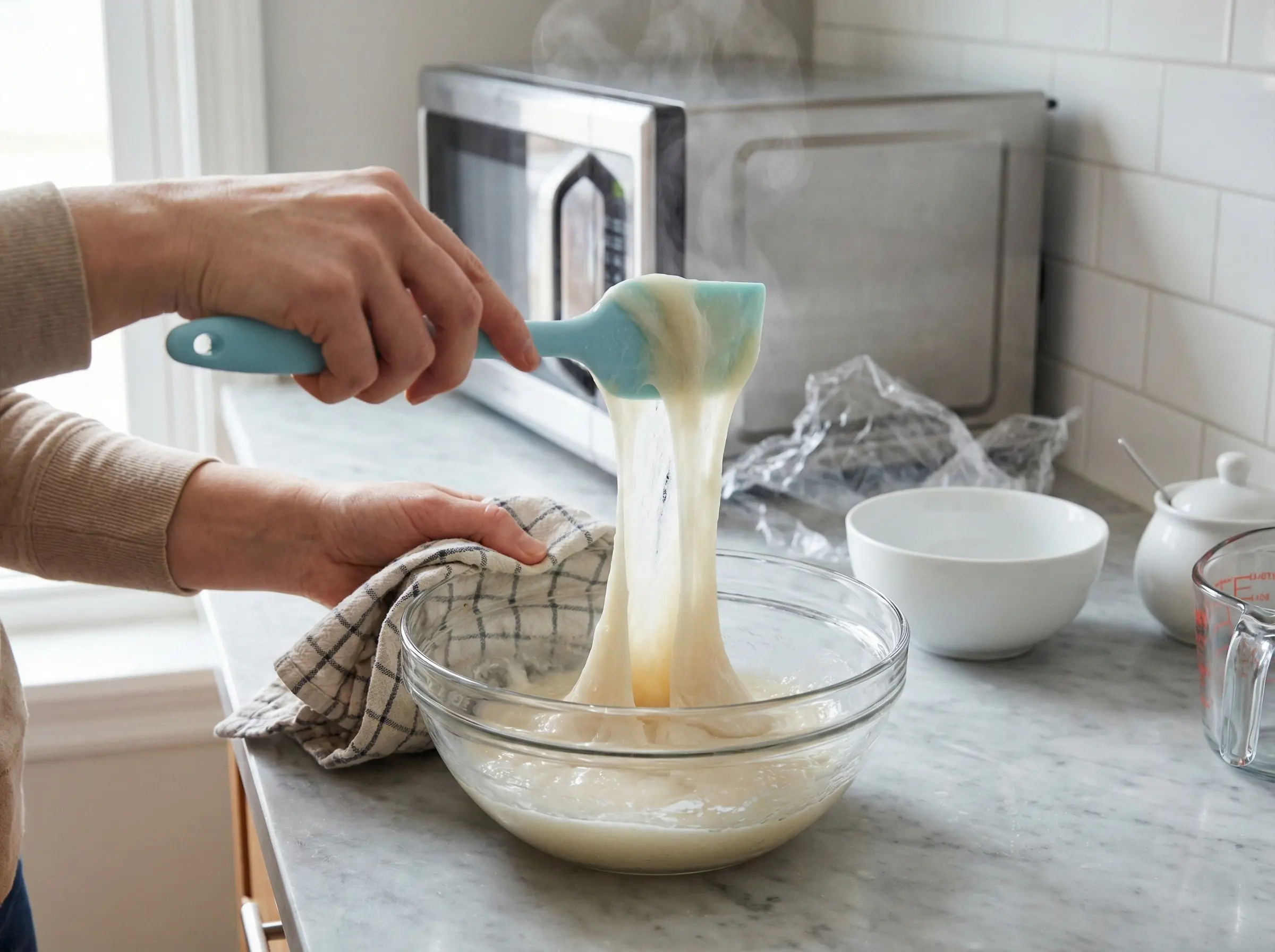 Prepare a clean work surface by generously dusting a large plate or baking sheet with potato starch or cornstarch - this prevents the mochi from sticking. Have additional starch ready for dusting your hands. Set out all your tools: a rubber spatula, a damp kitchen towel, and a small bowl of water for wetting your fingers. The mochi will be very hot and sticky when cooked, so proper preparation is essential for working with it quickly and safely.