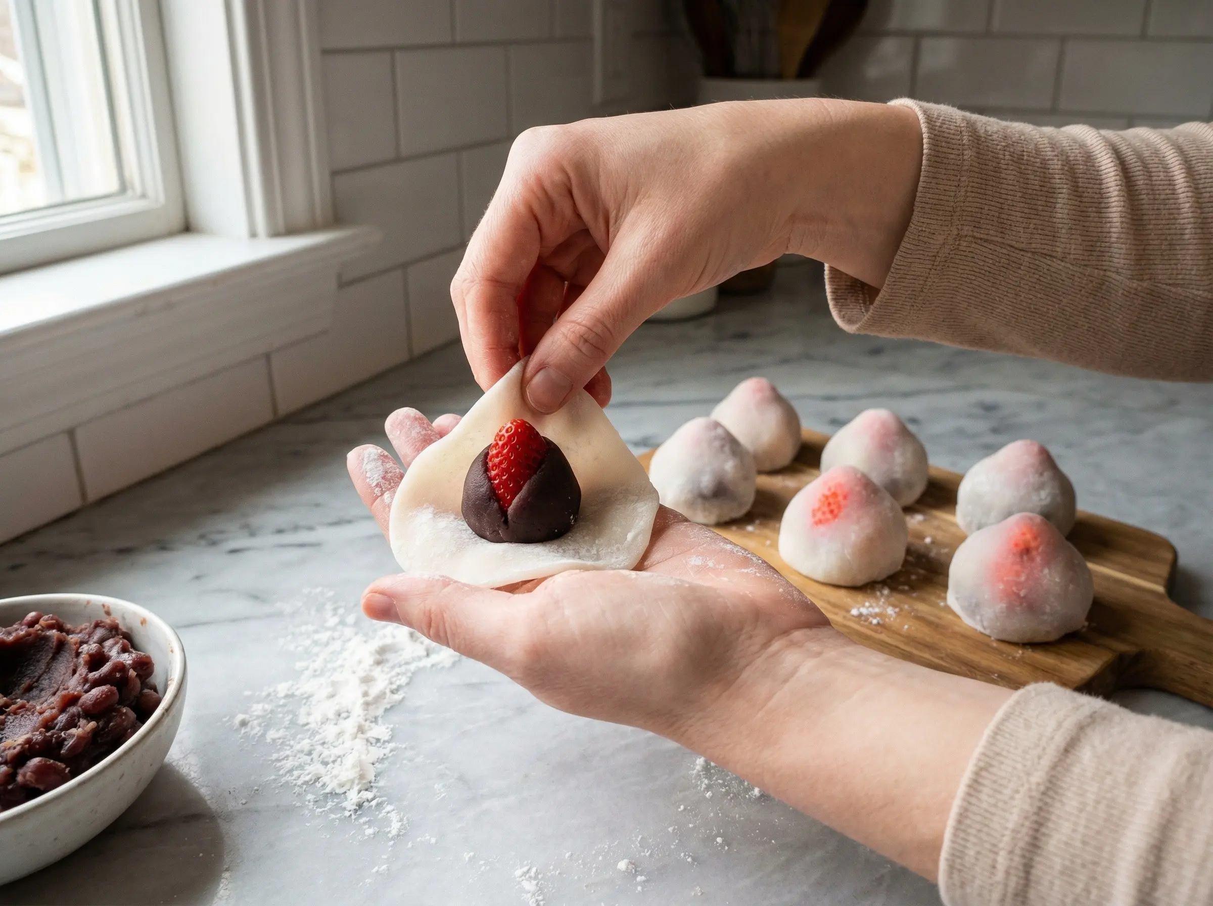 Ichigo daifuku is one of Japan's most beloved wagashi (traditional confections), a perfect marriage of chewy mochi, sweet red bean paste, and a fresh, juicy strawberry. While daifuku - mochi stuffed with sweet fillings - has been enjoyed in Japan since the late 18th century, the addition of fresh strawberry is a surprisingly modern innovation. Ichigo daifuku was invented in 1985 at a wagashi shop called Taimeiken in Tokyo's Ginza district, though several other shops also claim the honor. The creator's genius was recognizing that the tartness and juiciness of fresh strawberry would perfectly complement the sweetness of anko (red bean paste) and the neutral chewiness of mochi, creating a new classic that now defines spring in Japan. The timing of ichigo daifuku's creation coincided with Japan's development of exceptional strawberry varieties and year-round greenhouse cultivation, making premium strawberries available even in winter. Japanese strawberries are bred for sweetness, fragrance, and beautiful appearance - varieties like Amaou, Tochiotome, and Benihoppe are treated almost like precious gems. When strawberry season arrives in late winter and early spring, wagashi shops across Japan display their ichigo daifuku prominently, and long lines form at famous establishments. The confection has become so iconic that it now appears in countless variations: white bean paste instead of red, chocolate-flavored mochi, whole mochi coatings that leave the strawberry tip exposed like a little hat, and even luxury versions using the most expensive strawberries costing thousands of yen each. What makes ichigo daifuku so irresistible is the harmony of textures and temperatures. The mochi wrapper should be soft, stretchy, and slightly sticky - yielding to the teeth with a satisfying chew. The anko provides sweetness and earthy depth, while the strawberry bursts with bright, tart juice that cuts through the richness. When eaten fresh, the contrast between the room-temperature mochi and anko with the cold strawberry creates a multi-sensory experience. Visually, ichigo daifuku is enchanting - the pink or red of the strawberry glowing through the translucent white mochi like a lantern. It embodies the Japanese aesthetic of celebrating seasonal ingredients and finding beauty in simple things. Making ichigo daifuku at home is a rewarding project that connects you to this delicious tradition.