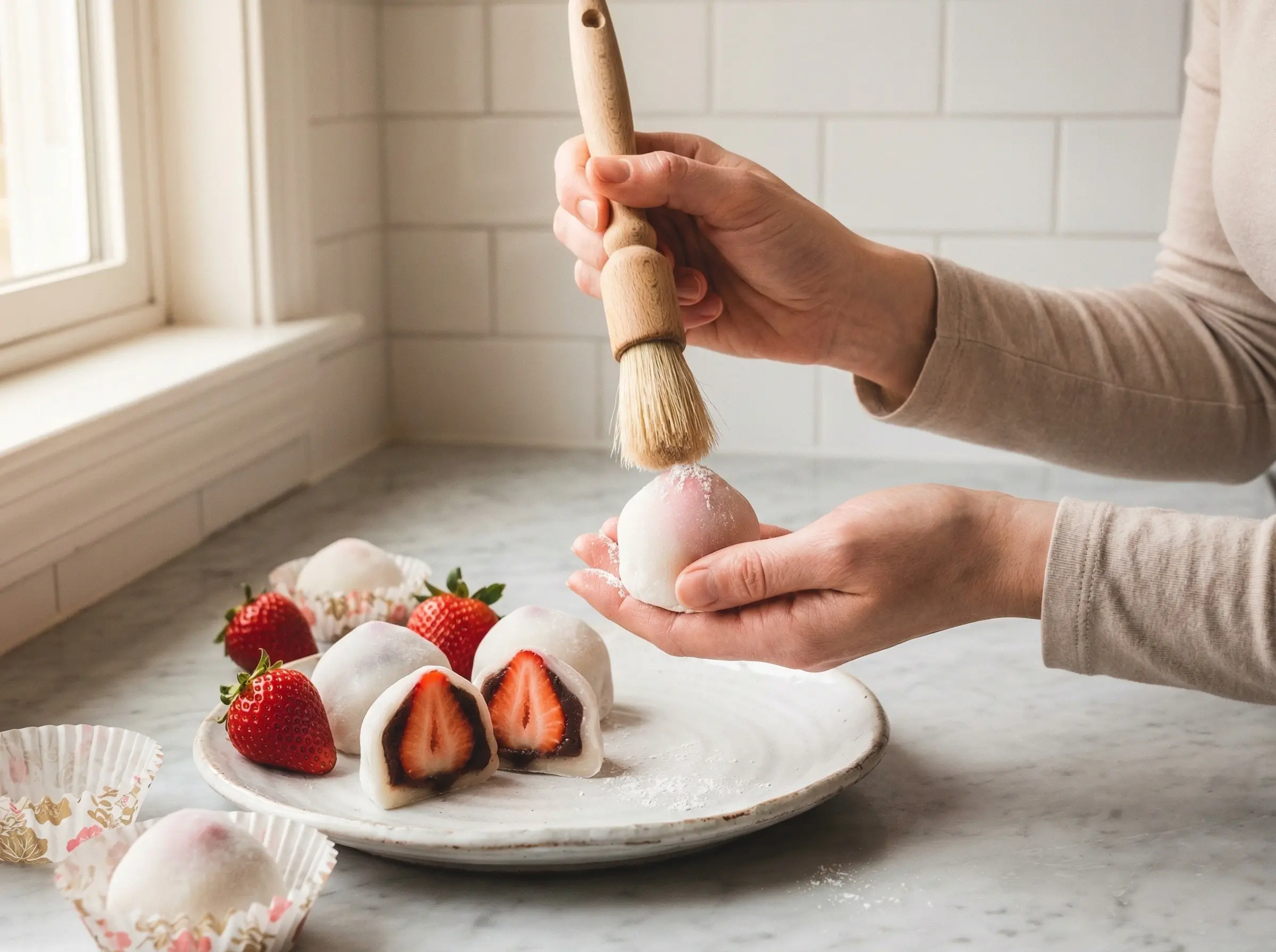 Gently brush off any excess starch from the finished daifuku with a soft pastry brush or your fingers - too much starch makes them look dusty and affects the texture. Place each completed daifuku on a serving plate or in individual paper cups. Ichigo daifuku are best eaten the same day they are made, ideally within a few hours. The mochi will harden over time and the strawberry will begin to release juice that makes the daifuku soggy. If you must store them, keep at cool room temperature for up to 6-8 hours - do not refrigerate, as this hardens the mochi. Serve as a beautiful ending to a Japanese meal, with afternoon tea, or as a special seasonal treat. When you bite in, you should experience the soft, chewy mochi, the sweet earthy anko, and finally the burst of fresh, juicy strawberry - a perfect harmony of textures and flavors.