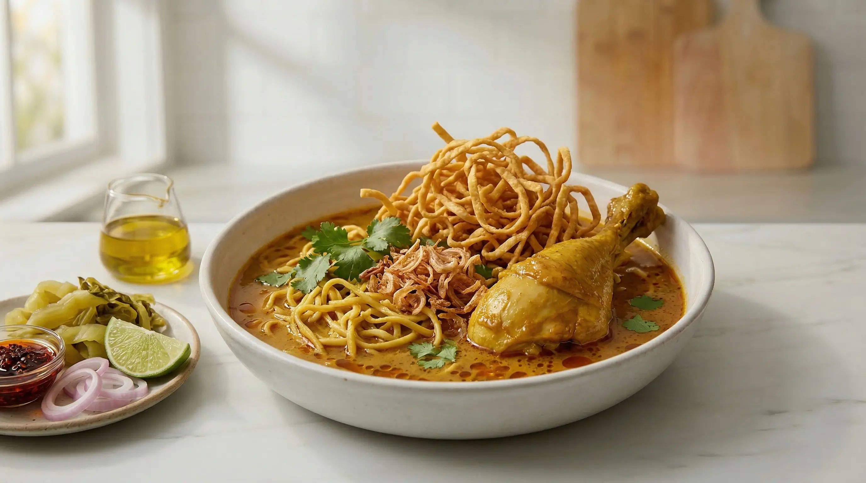 Laksa is one of Southeast Asia's most beloved noodle soups, a rich and aromatic bowl that represents the beautiful collision of Malay, Chinese, and Indian culinary traditions. The dish is most closely associated with the Peranakan (Straits Chinese) community - descendants of Chinese immigrants who settled in the Malay Peninsula and Singapore centuries ago and developed a unique hybrid culture. Peranakan cuisine, also called Nyonya cooking, blends Chinese techniques with Malay spices and ingredients, and laksa is its crown jewel. The name "laksa" may derive from the Sanskrit "laksha" meaning "many," referring to the countless noodles in the bowl, or from the Persian "lakhshah" for a type of noodle. Laksa exists in many regional variations across Malaysia, Singapore, and Indonesia, each with passionate devotees. Curry laksa (laksa lemak), the version featured here, is coconut milk-based with a rich, spicy curry broth - this is the most internationally recognized style, found everywhere from Kuala Lumpur to Penang. Asam laksa from Penang is entirely different - a sour, fish-based broth without coconut milk, flavored with tamarind and mackerel. Sarawak laksa from Borneo uses a sambal-based broth with prawns and chicken. Katong laksa from Singapore cuts the noodles short so they can be eaten with a spoon. Each version inspires fierce regional pride and heated debates about authenticity. What makes laksa so extraordinary is the complexity of its spice paste - the rempah - that forms the aromatic foundation of the dish. This paste blends chillies, galangal, lemongrass, candlenuts, shrimp paste, and a dozen other ingredients into something almost alchemically fragrant. When fried in oil until the paste "splits" and releases its oils, then simmered with coconut milk and stock, the rempah transforms into a broth that is simultaneously creamy and bright, rich and refreshing. Rice noodles or yellow egg noodles swim in this crimson-tinted soup, topped with shrimp, fish cake, tofu puffs, bean sprouts, and hard-boiled eggs. A spoonful of sambal and fresh laksa leaves (Vietnamese coriander) complete the bowl. Laksa is comfort food elevated to art - a dish that demands time and care but rewards the cook with something unforgettable.