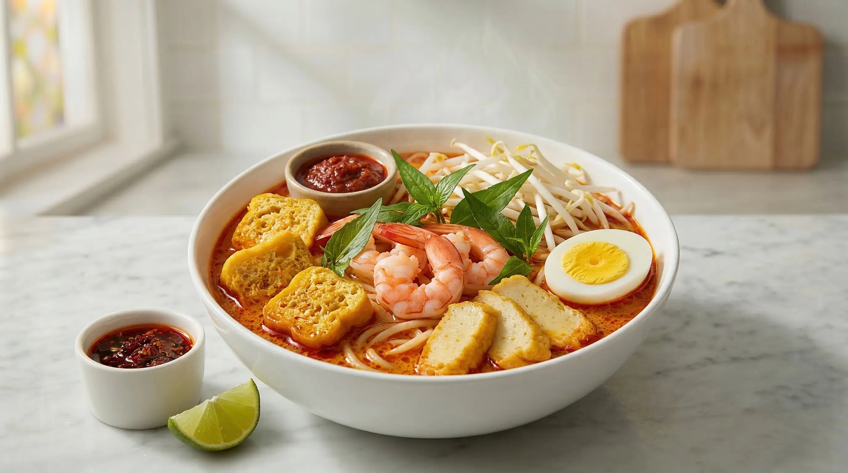 Assemble and serve. Place noodles in deep bowls. Ladle the hot laksa broth generously over the noodles, including pieces of tofu puffs and fish cake. Arrange the cooked shrimp, bean sprouts, and halved hard-boiled eggs on top. Garnish with fresh laksa leaves (daun kesum) or Vietnamese coriander - these herbs have a distinctive citrusy, peppery flavor that is traditional and irreplaceable. Serve immediately with sambal on the side for extra heat and lime wedges for squeezing. The proper way to eat laksa is to first take a sip of the broth, then gather noodles with chopsticks while using a spoon for the soup. Each bite should combine silky noodles, rich broth, and varied toppings. Laksa does not wait - serve and eat immediately while the broth is hot and the noodles are at their best.