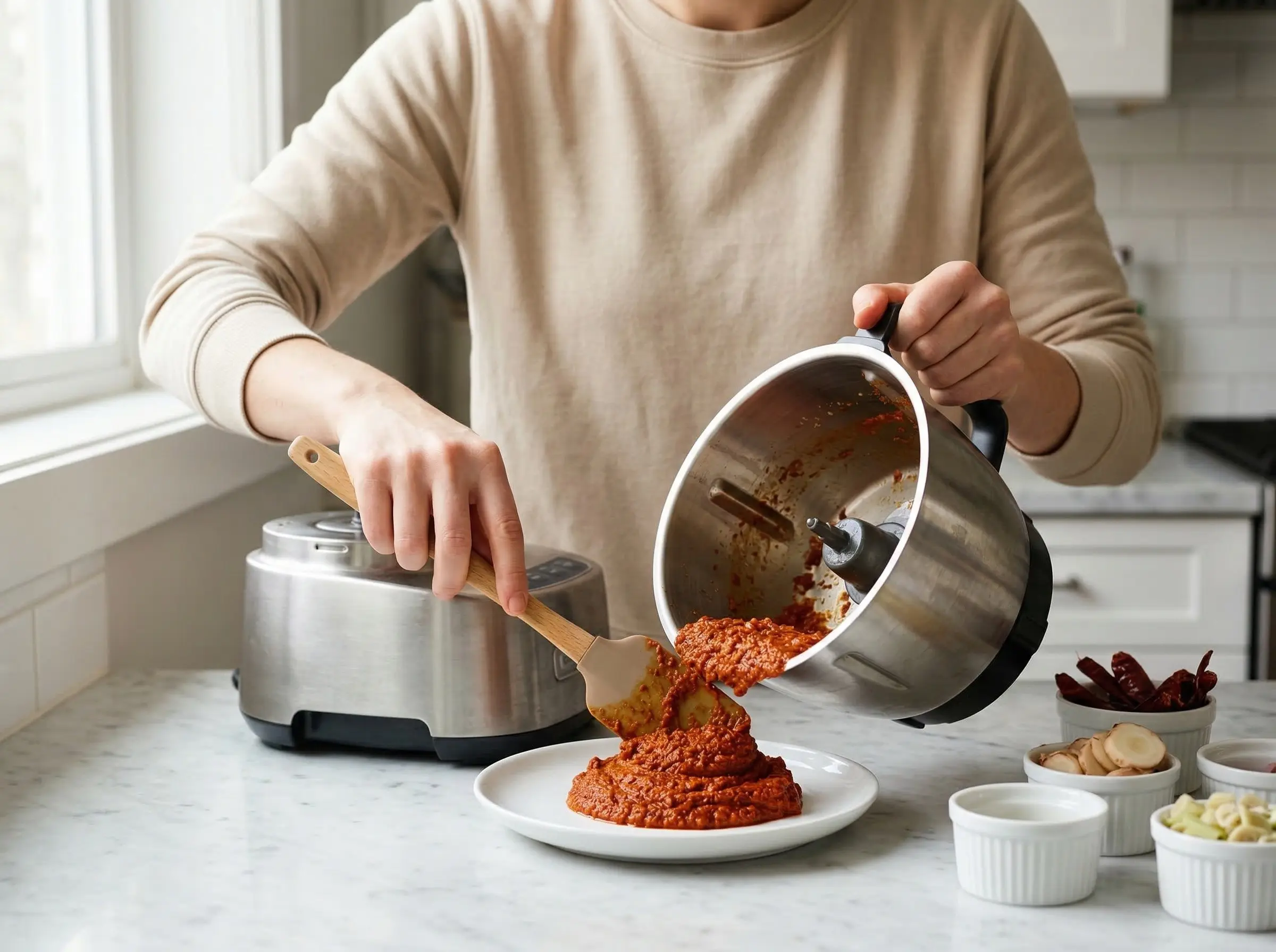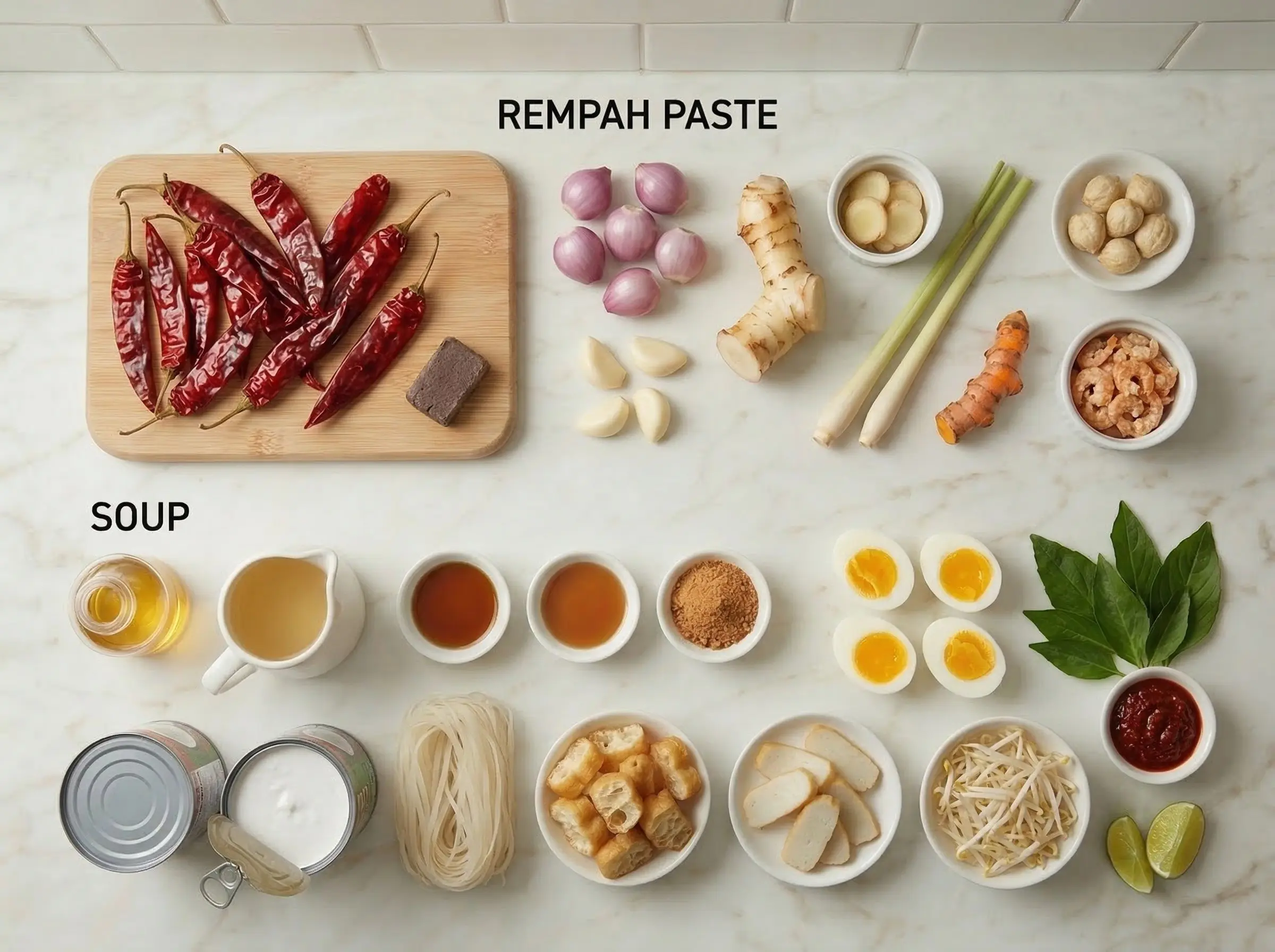 Make the rempah paste. Soak the dried chillies in hot water for 20-30 minutes until softened; drain. Soak the dried shrimp in warm water for 15 minutes; drain. Combine all rempah ingredients in a food processor or blender: drained chillies, shallots, garlic, galangal, lemongrass, turmeric, candlenuts, drained dried shrimp, and belacan. Blend to a smooth paste, adding a few tablespoons of water as needed to help it process. The paste should be as smooth as possible - this is the soul of your laksa and worth the effort of thorough blending.