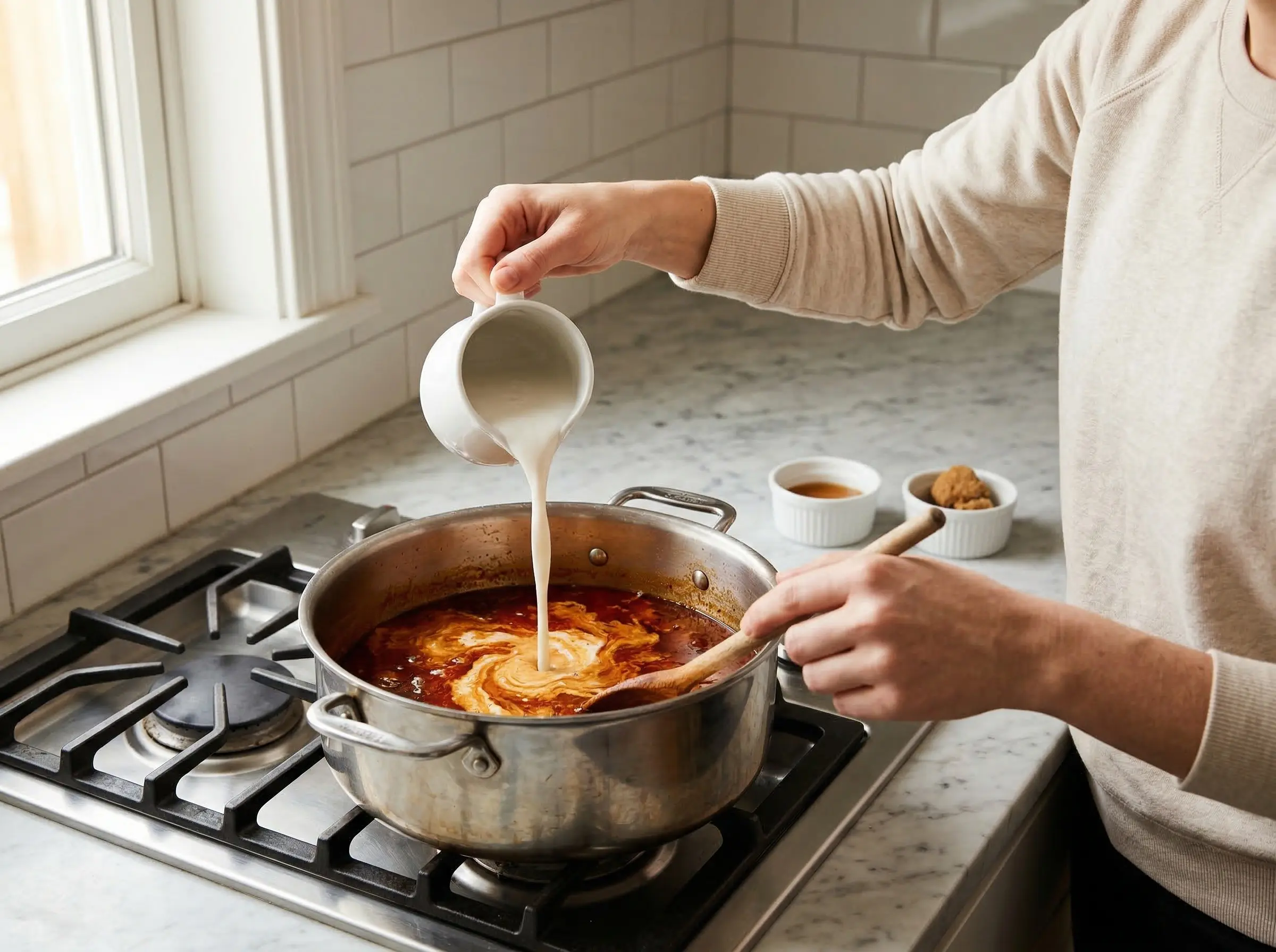 Build the laksa broth. Pour in the chicken stock, stirring to incorporate the fried paste. Add the coconut milk, fish sauce, and palm sugar. Stir well and bring to a gentle simmer. Do not boil vigorously or the coconut milk may separate. Simmer for 15-20 minutes to allow the flavors to meld. Taste and adjust seasoning - the broth should be rich, creamy, and well-balanced between savory, sweet, and spicy. Add more fish sauce for saltiness, sugar for sweetness, or sambal for heat.