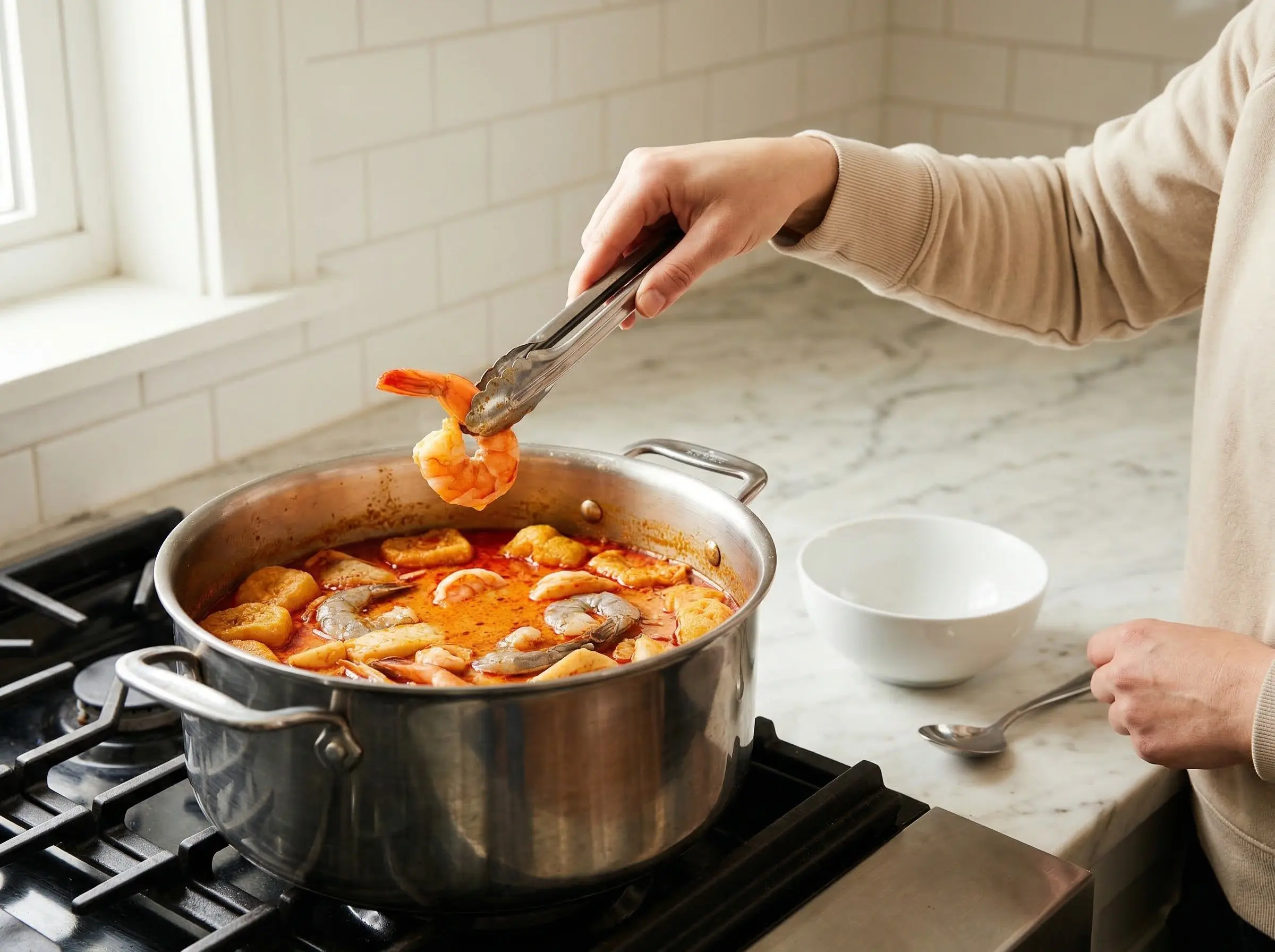 Cook the shrimp. Add the shrimp to the simmering broth and cook for 2-3 minutes until pink and just cooked through. Remove immediately to prevent overcooking. Add the tofu puffs and fish cake slices to the broth to warm through for 1-2 minutes.