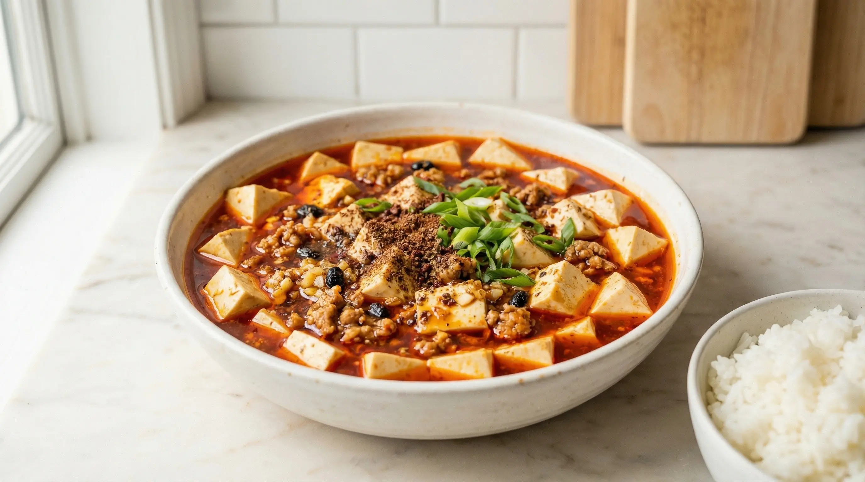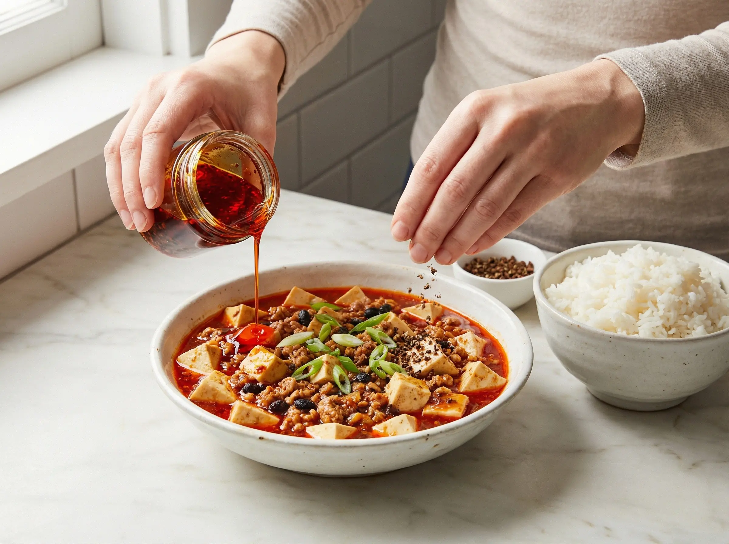 Transfer the mapo tofu to a serving bowl, being careful to keep the tofu cubes as intact as possible. Drizzle with the chili oil - this adds glossy heat and beautiful red color. Sprinkle the remaining ground Sichuan peppercorn over the top for an extra numbing kick. Garnish with the sliced green onion greens. Serve immediately over steaming white rice - the rice is essential for absorbing the intensely flavorful, spicy sauce and providing relief from the heat. In Sichuan, mapo tofu is often served as part of a larger meal with milder dishes to balance the intense flavors. For an even more authentic experience, serve with additional chili oil and ground Sichuan peppercorn on the side so diners can adjust the heat and numbness to their preference.